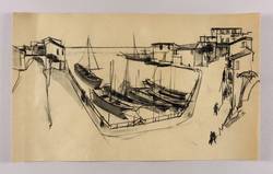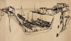 1956. Zeichnung / Kreide & Tusche, in Schwarz, hellgrau laviert, auf gelbem Karton. – Originale Künstlergrafik, von Gertrud Eichhorn. – Unikat. – 32,4 x 53,7 cm (Darstellung / Blatt).