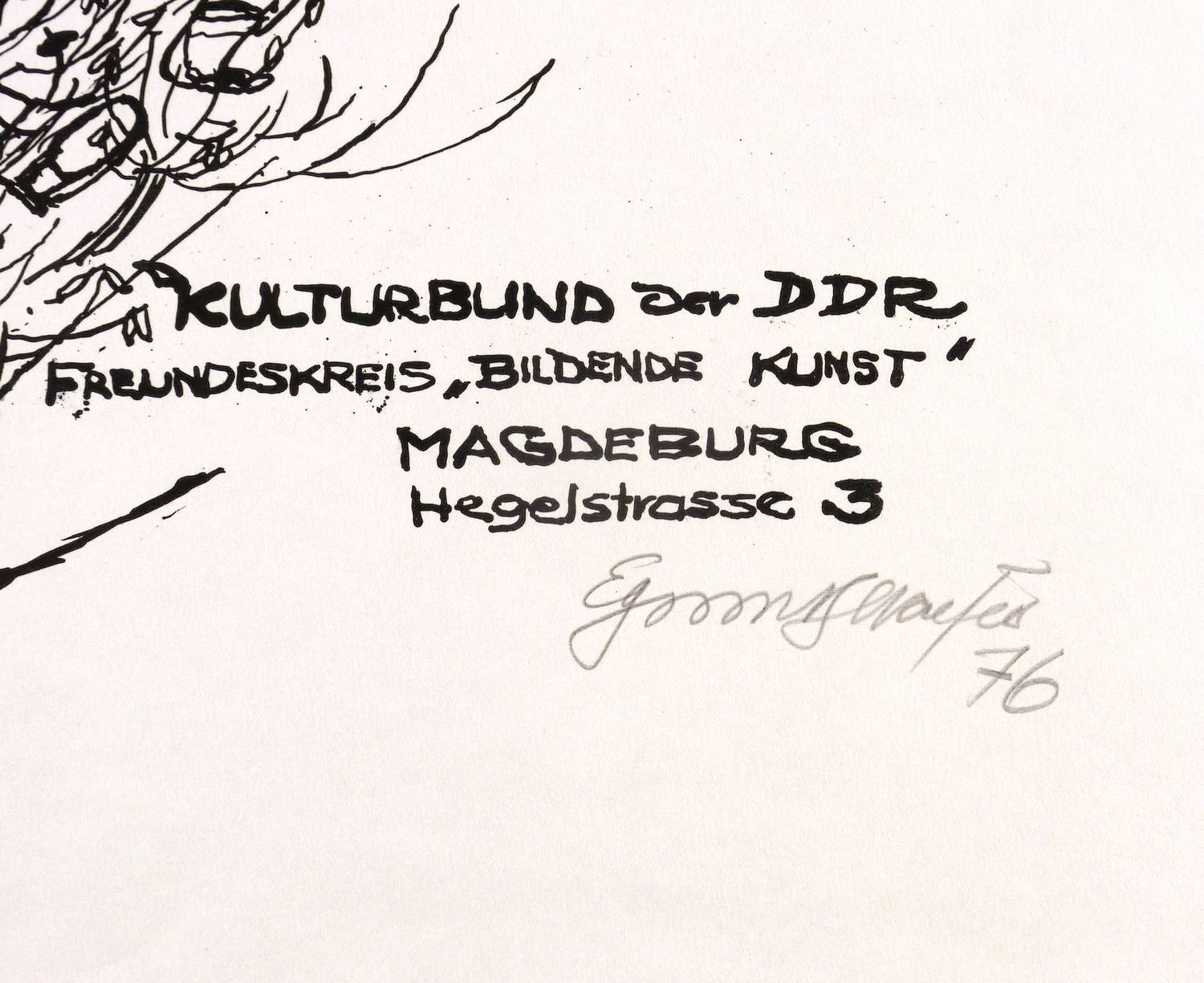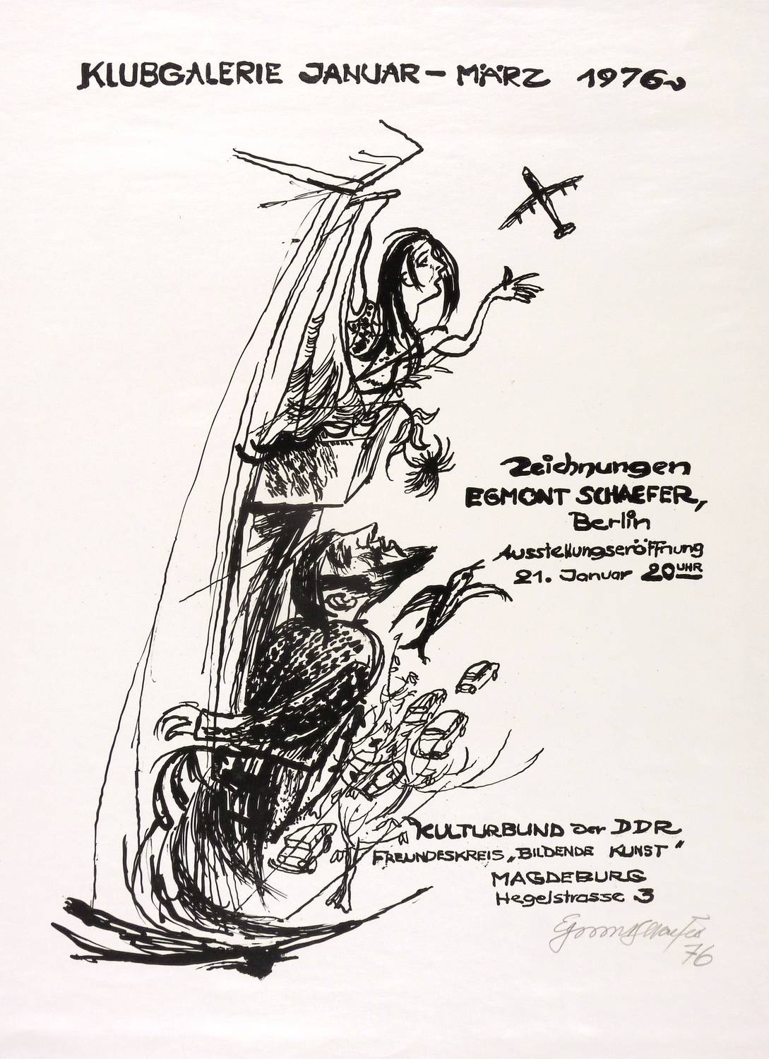 Rechts unten in Bleistift signiert und datiert: ″Egmont Schaefer 76″. – Originalgrafisches Plakat zur Ausstellung ″Zeichnungen. Egmont Schaefer″ in der Klubgalerie des Kulturbundes Magdeburg 20. Januar - März 1976. – Sehr guter Zustand.
