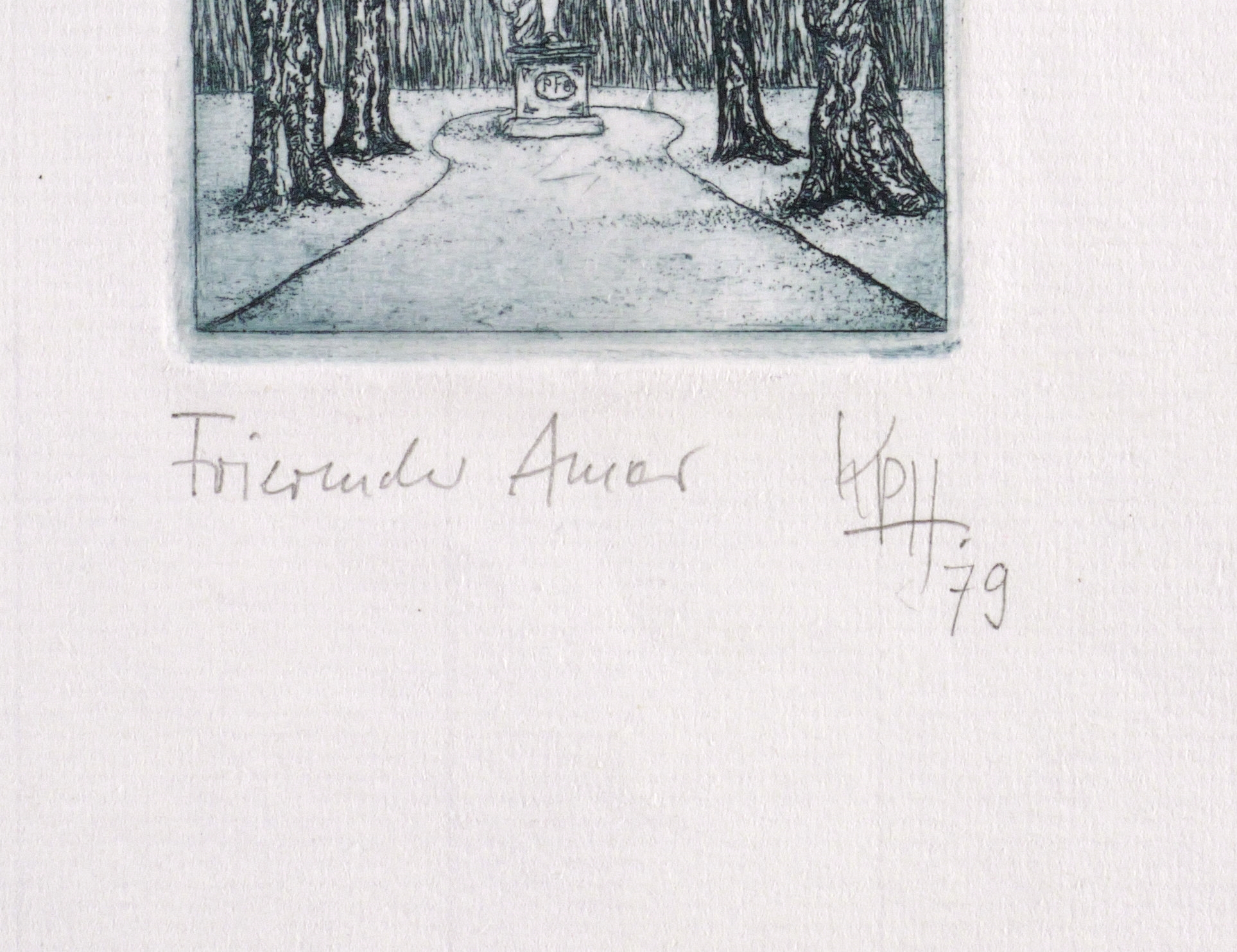 1979. Radierung / Strichätzung, in Schwarzblau, auf feinstem hellchamois Ingres. – Originale Künstlergrafik, von Klaus-Peter Holzhauer. – 5,8 x 4,9 cm (Darstellung / Platte), 21 x 11 cm (Blatt).