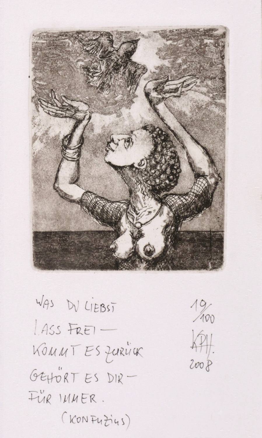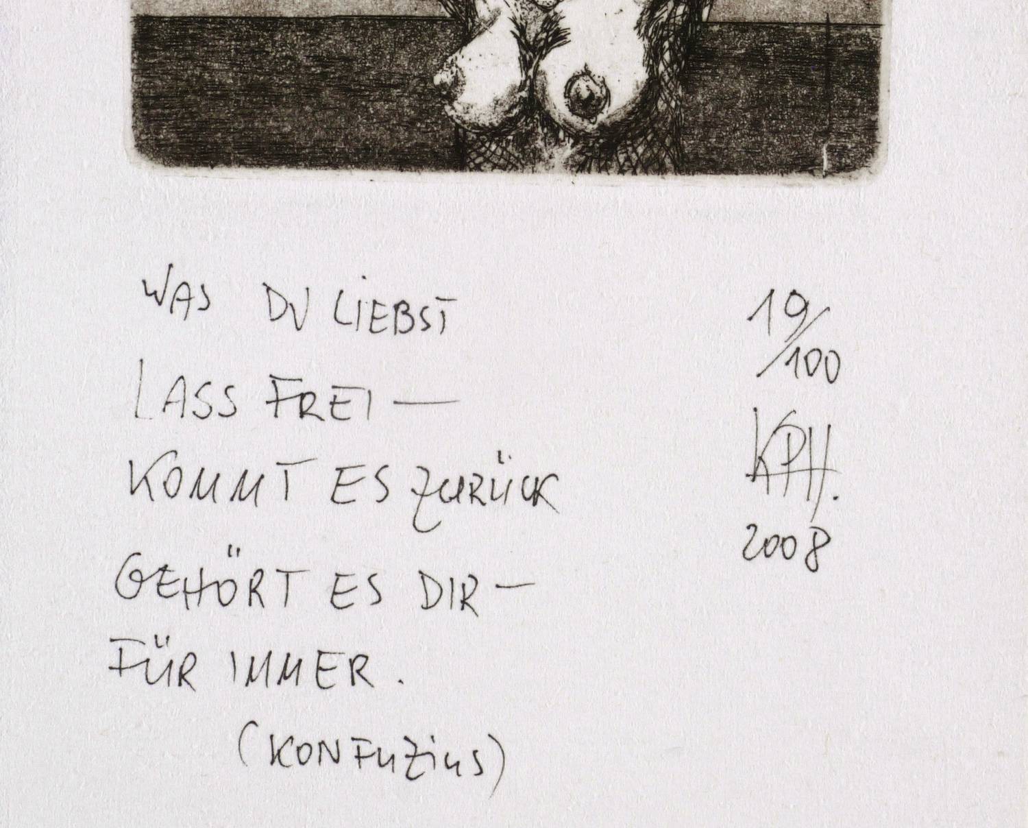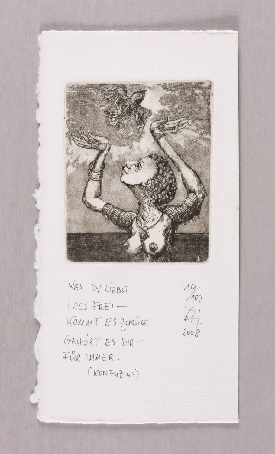 Rechts unten in Bleistift signiert und datiert: ″KPH 08″. Darüber Auflagenbezeichnung: ″19/100″. Links bezeichnet: ″WAS DU LIEBST / LASS FREI - / KOMMT ES ZURÜCK / GEHÖRT ES DIR - / FÜR IMMER. / (KONFUZIUS)″. Blindstempel des Künstlers. – Sehr guter Zustand.