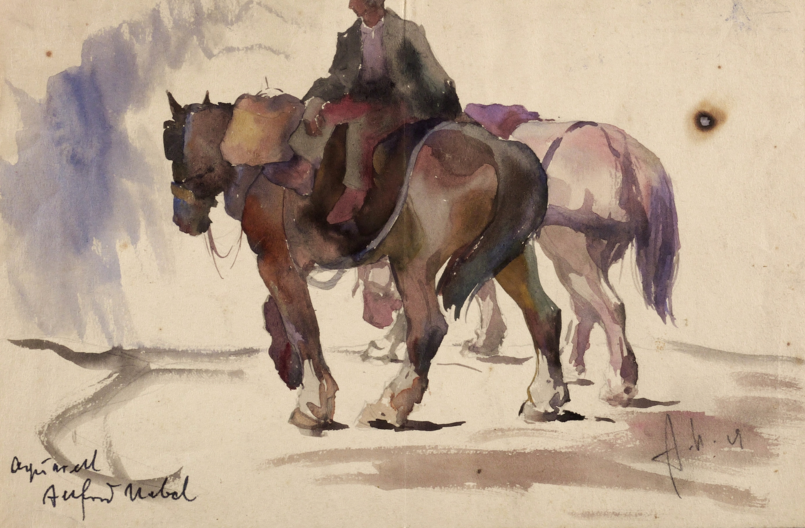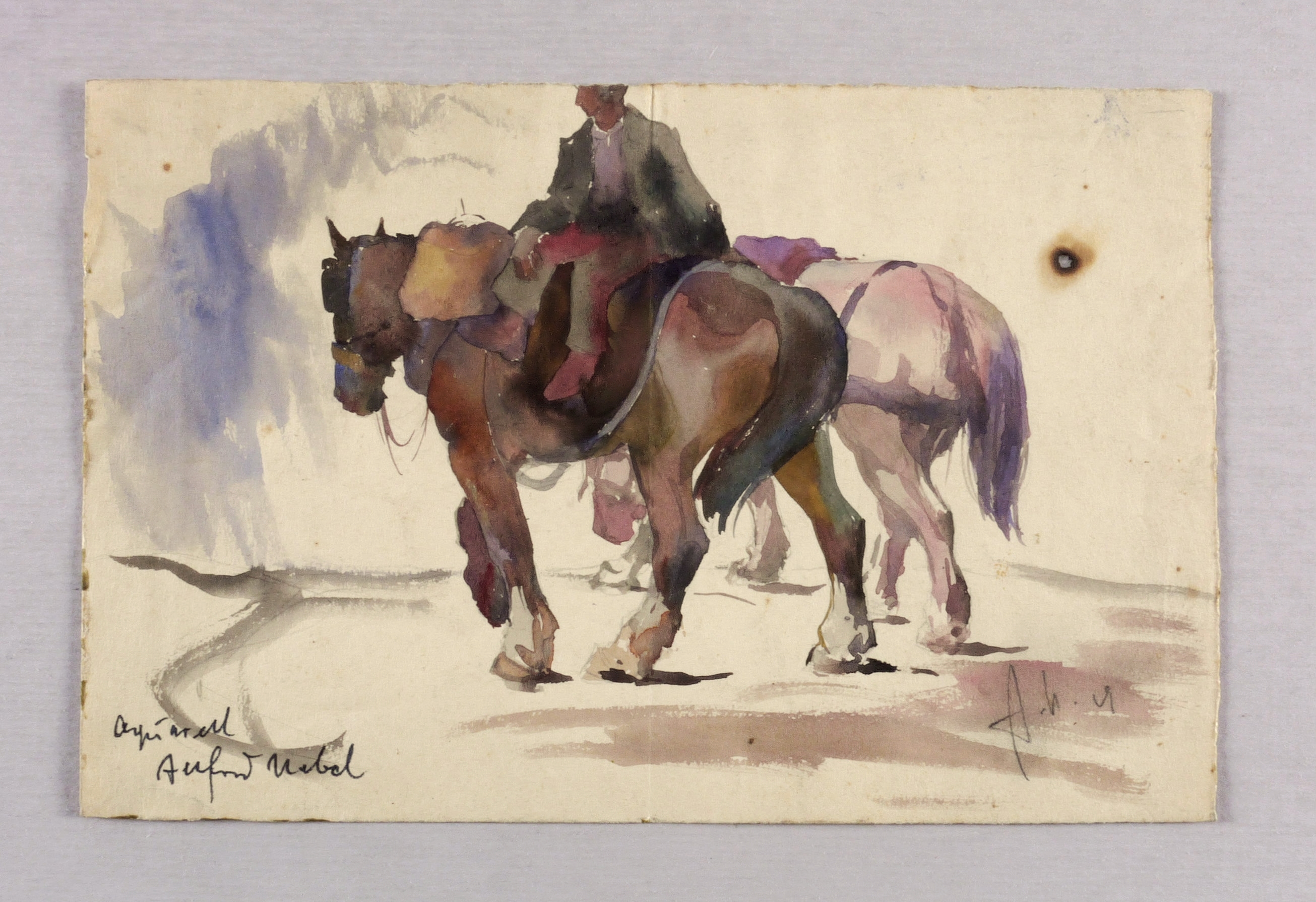 Links unten in schwarzer Feder signiert: ″Aquarell Alfred Uebel″. Rechts nochmals in Bleistift signiert und datiert: ″A.U. 29″. – Papier mit einigen Altersspuren und Schadstellen, rechts oben kleines Brandloch. Eine vertikale Lagerfalte. Insgesamt mangelhafter bis mäßig guter Zustand.