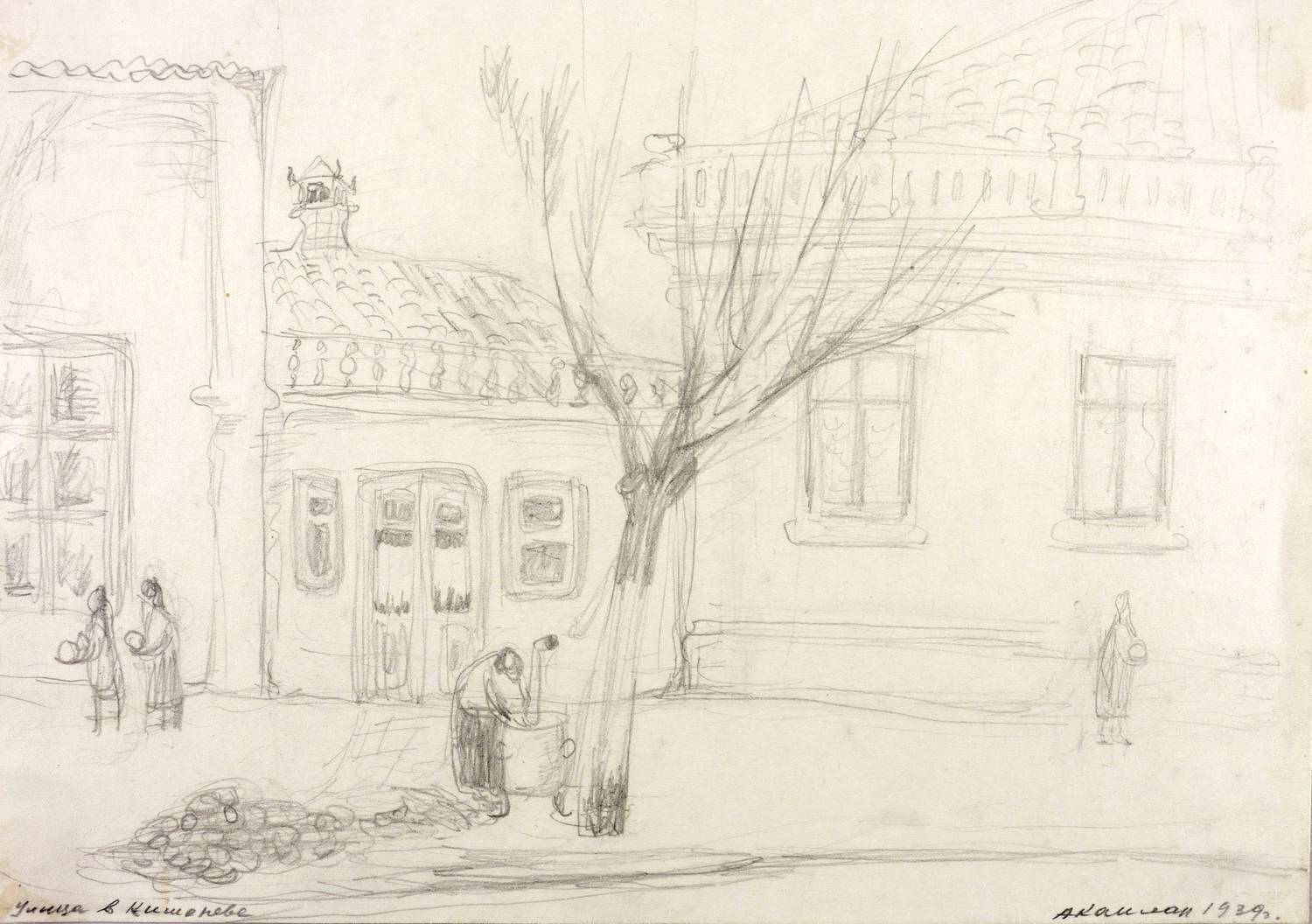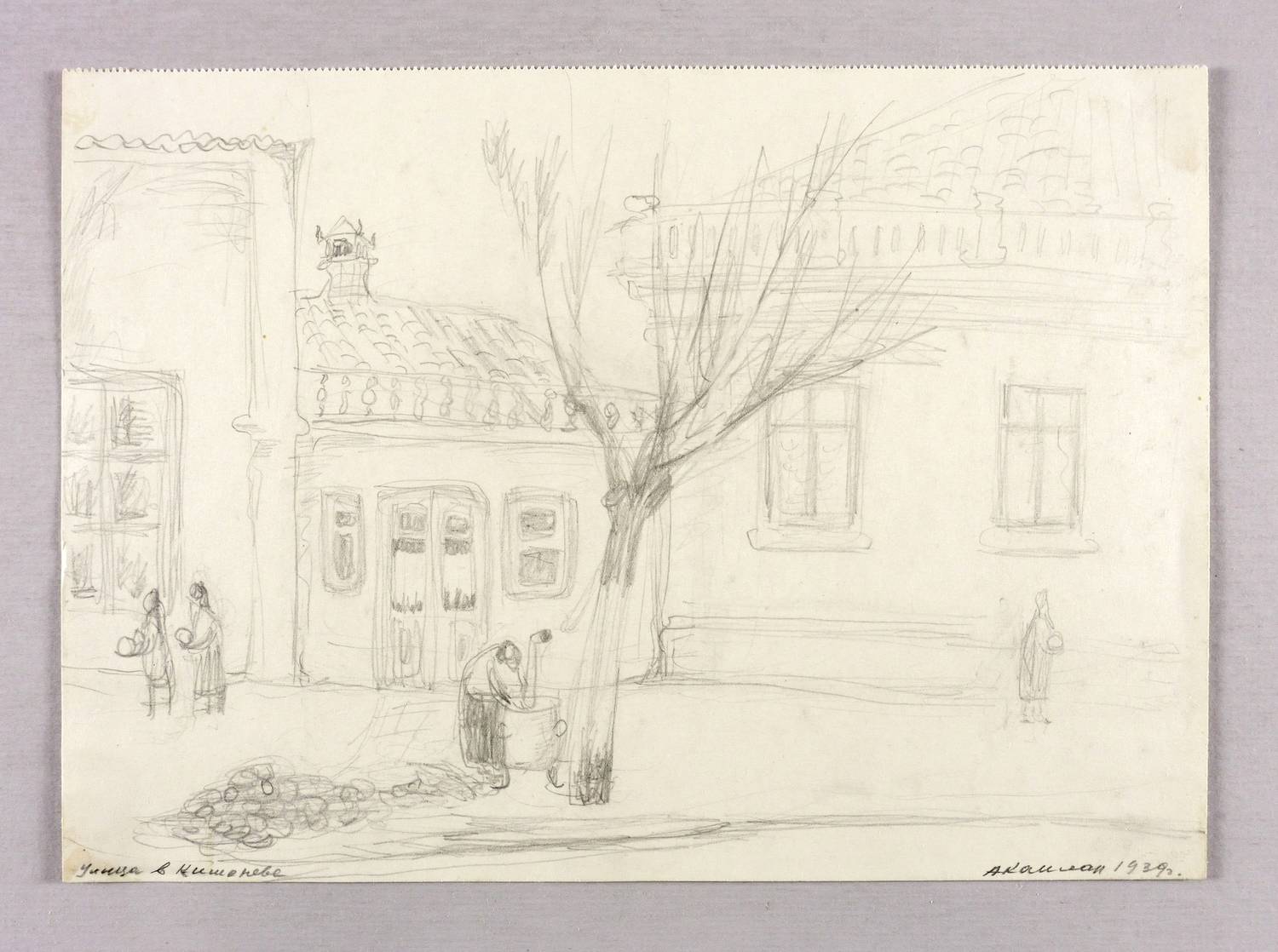 Rechts unten in Bleistift in kyrillischer Schrift signiert und datiert: ″АКаплан 1939″. Links Titel: ″Улица в Кишиневе″. – Nicht im Werkverzeichnis von Kusnezow. Allerdings vielleicht gemeint mit dem sonst passenden Eintrag unter dem Folgejahr 1940: ″136. Kischinjew. Straße. Bleistift. 220 x 310 [mm]″. – Provenienz: Sammlung Inge & Erhard Frommhold, Dresden. – Papier mit leichten Altersspuren, in den Blattecken schwach durchschlagende Klebereste einer älteren Montierung. Insgesamt noch guter Zustand.