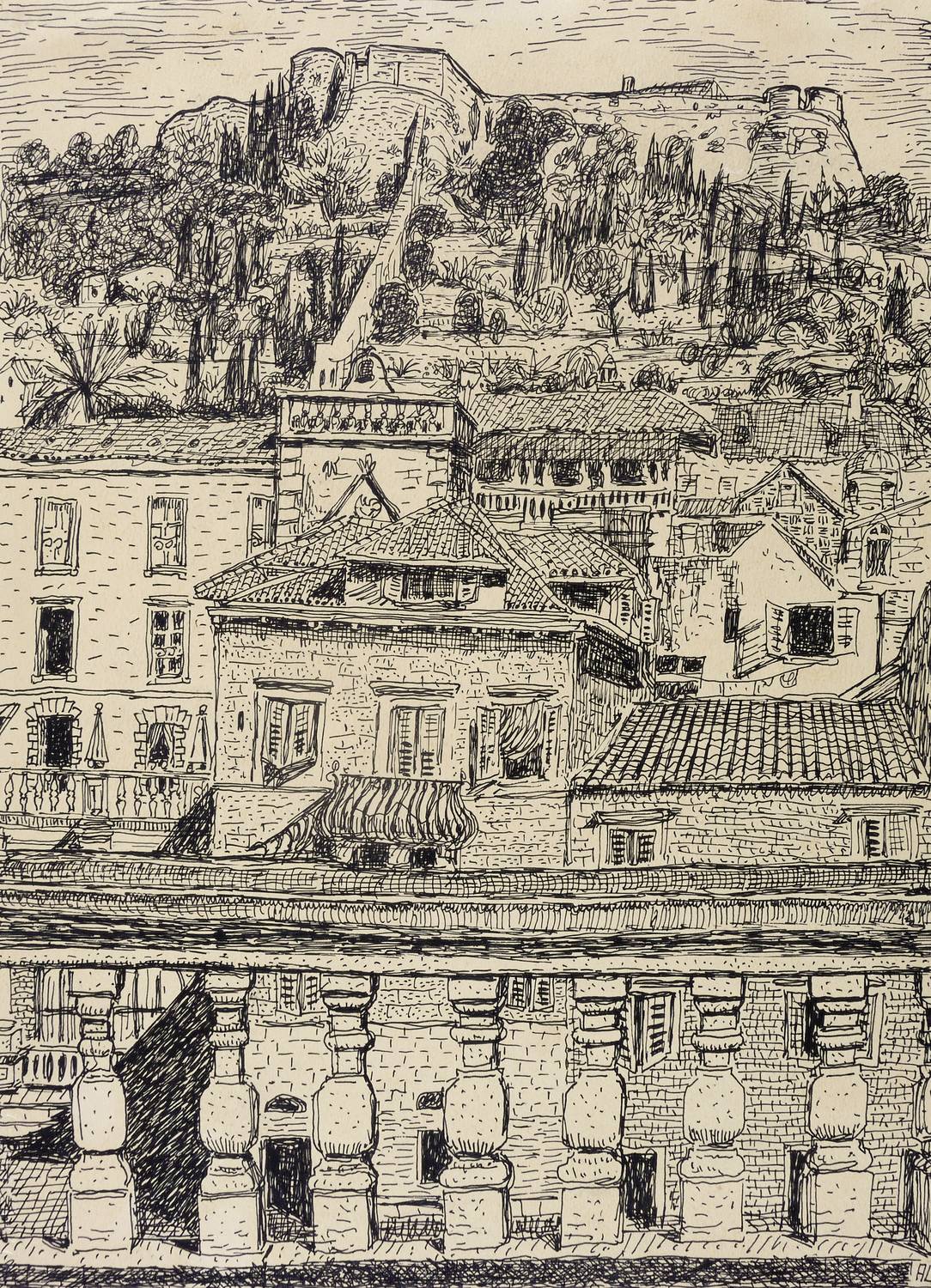 1961. Zeichnung / Feder, in schwarzer Tusche, auf gelbem Gersco. – Originale Künstlergrafik, von Axl Leskoschek. – Unikat. – 33,6 x 24,6 cm (Darstellung / Blatt).