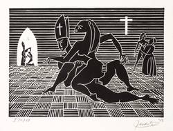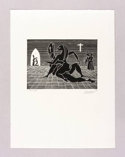 1986. Linolschnitt, in Schwarz, auf rauem hellchamois Bütten. – Originale Künstlergrafik, von Hendrik Hause. – Auflage Exemplar Nr. 1/10. – 12,5 x 17,6 cm (Darstellung / Druckbild), 35 x 27 cm (Blatt).