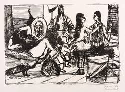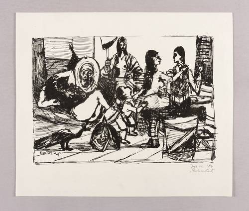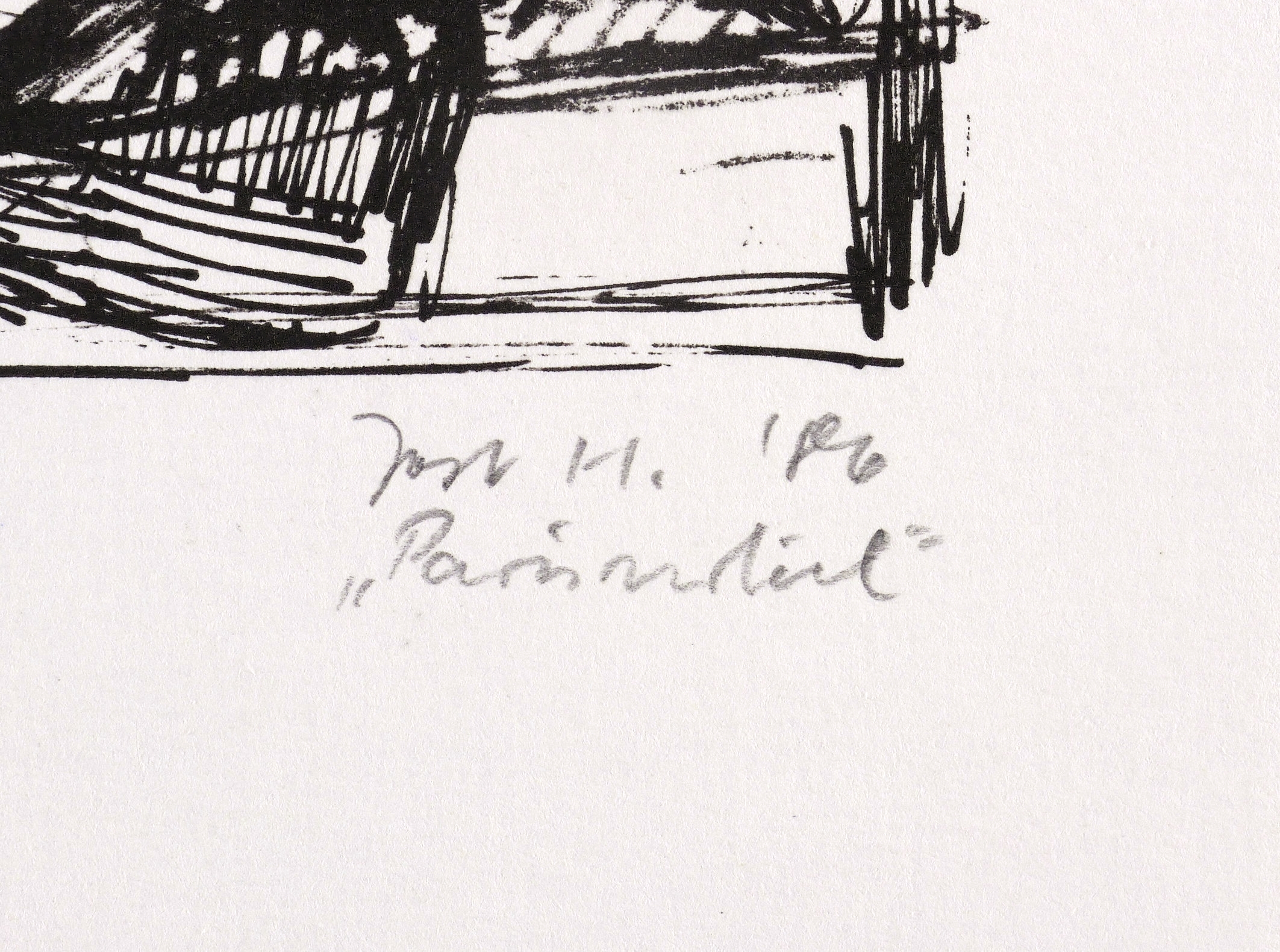 1986. Offsetlithografie / Feder & Pinsellithografie, in Schwarz, auf hellgelbem Velinkarton. – Originale Künstlergrafik, von Jost Heyder. – 20,0 x 28,5 cm (Darstellung / Druckbild), 29 x 34 cm (Blatt).