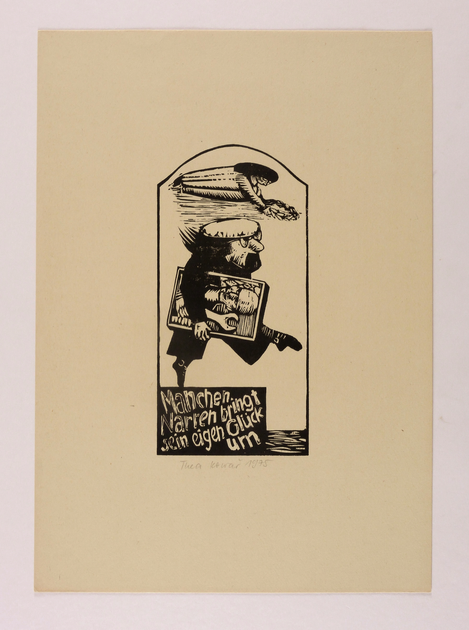 Unterhalb in Bleistift signiert und datiert: ″Thea Kowar 1975″. Im Druckstock unten Inschrift: ″Manchen Narren bringt sein eigen Glück um″. Verso Stempel der Plauener Grafikgemeinschaft. – Sehr guter Zustand.