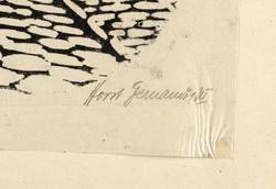 Um 1935. Linolschnitt, in Schwarz, auf gelblichem Japan. – Originale Künstlergrafik, von Deutsch (20. Jh.). – 30,5 x 23,0 cm (Darstellung / Druckbild), 34,9 x 26,4 cm (Blatt), 38 x 30 cm (Trägerblatt).