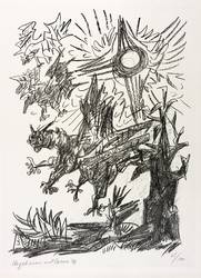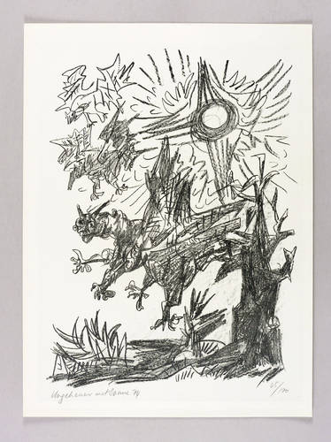 Nicht handsigniert. Rechts unten in Bleistift Auflagenbezeichnung: ″45/170″. Links Titel und Jahr: ″Ungeheuer und Sonne 74″. Verso Nachlass-Stempel mit Unterschrift: ″E Graetz-Shaw″. – Sehr guter Zustand.