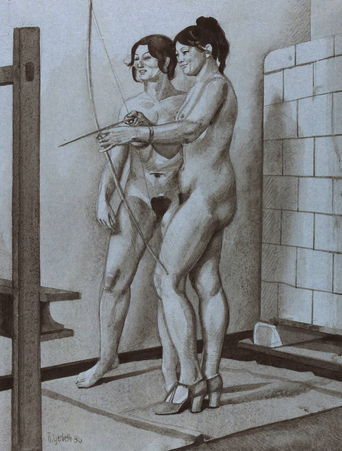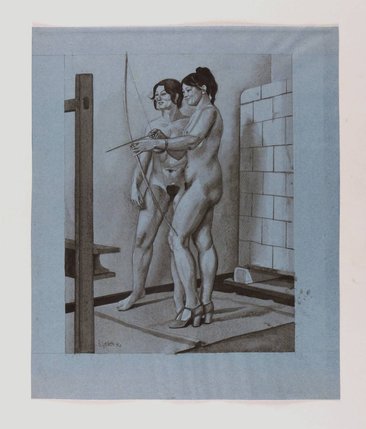 1980. Zeichnung / Pinselzeichnung, in Sepia, auf blau getöntem Karton. – Originale Künstlergrafik, von Dieter Gerbeth. – Unikat. – 34,1 x 26,0 cm (Darstellung), 43 x 35 cm (Blatt).