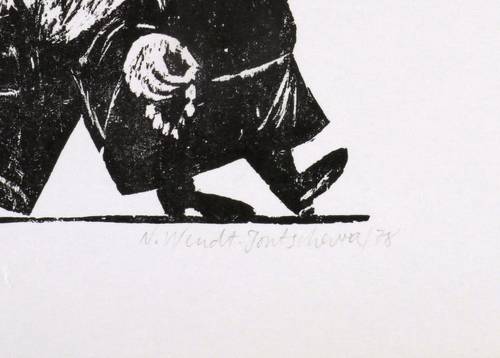 1978. Holzschnitt, in Schwarz, auf glattem hellgelbem Papier. – Originale Künstlergrafik, von Newena Wendt-Jontschewa. – 6,6 x 9,1 cm (Darstellung / Druckbild), 11 x 15 cm (Blatt).
