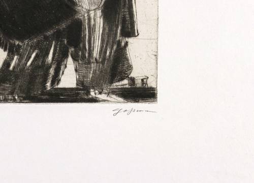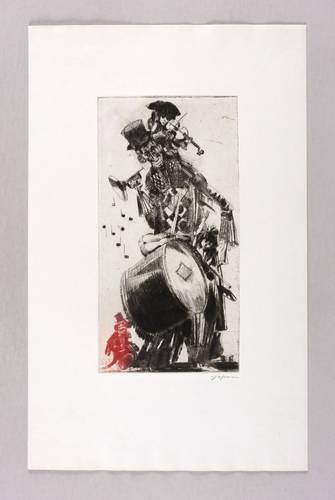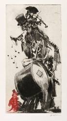 Um 1965. Farbradierung / Kaltnadel & Roulette, in Rot & Schwarz, auf festem hellgelbem Velin. – Originale Künstlergrafik, von Gerhard Goßmann. – 24,8 x 12,7 cm (Darstellung / Platte), 40 x 26 cm (Blatt).