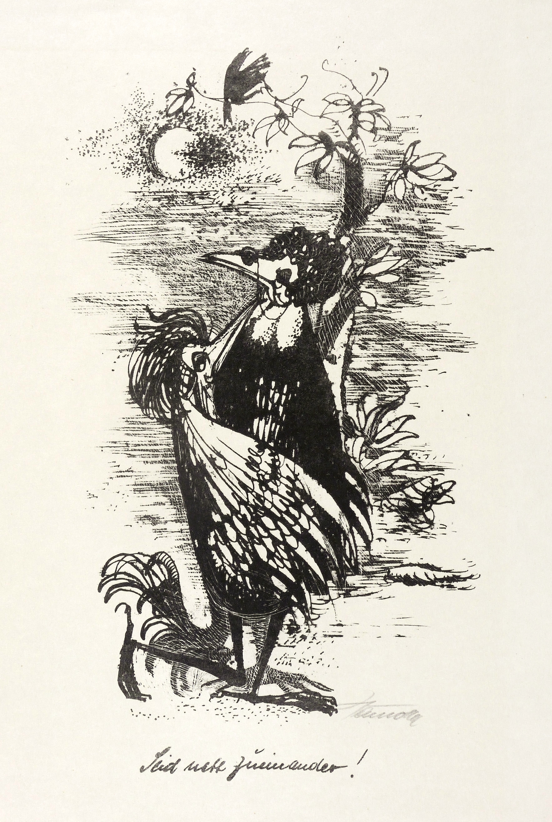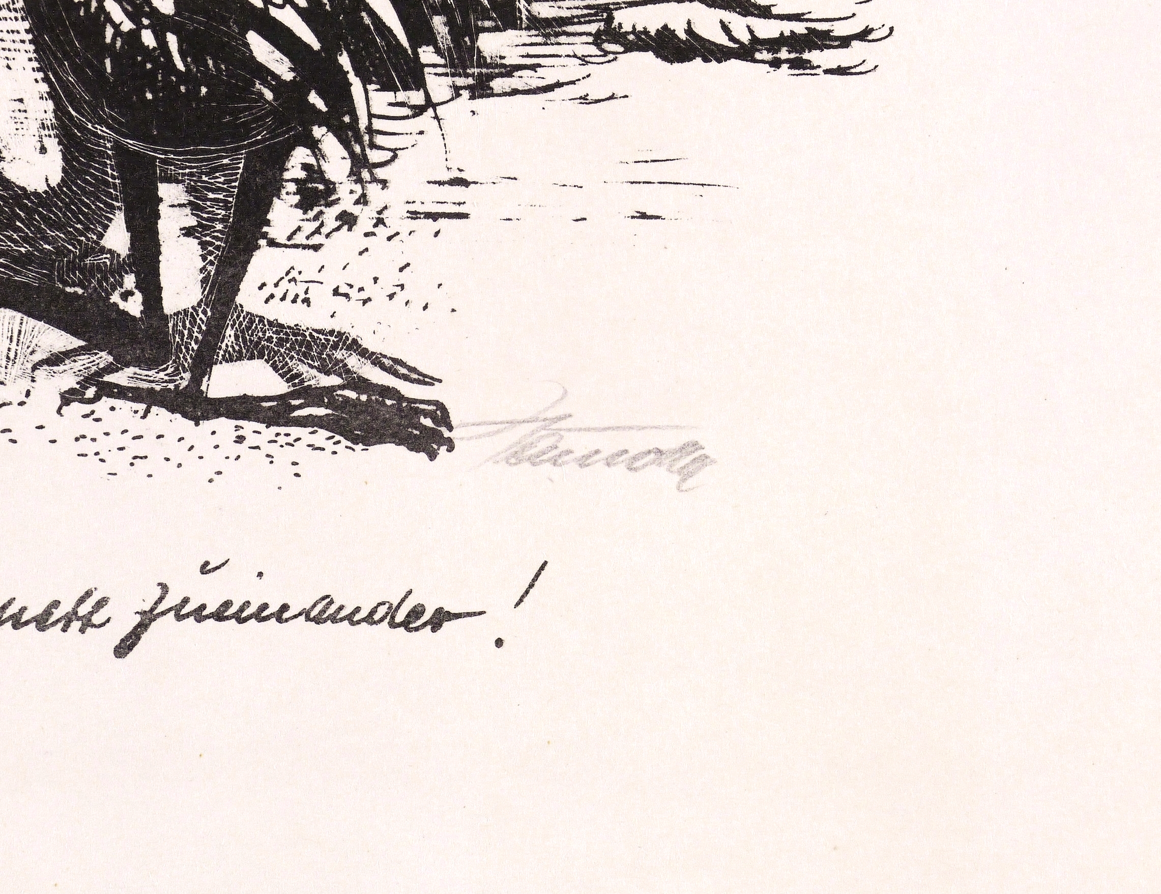 Rechts unten in Bleistift signiert: ″Hausotte″. Im Stein Inschrift: ″Seid nett zueinander!″ – Sehr guter Zustand.