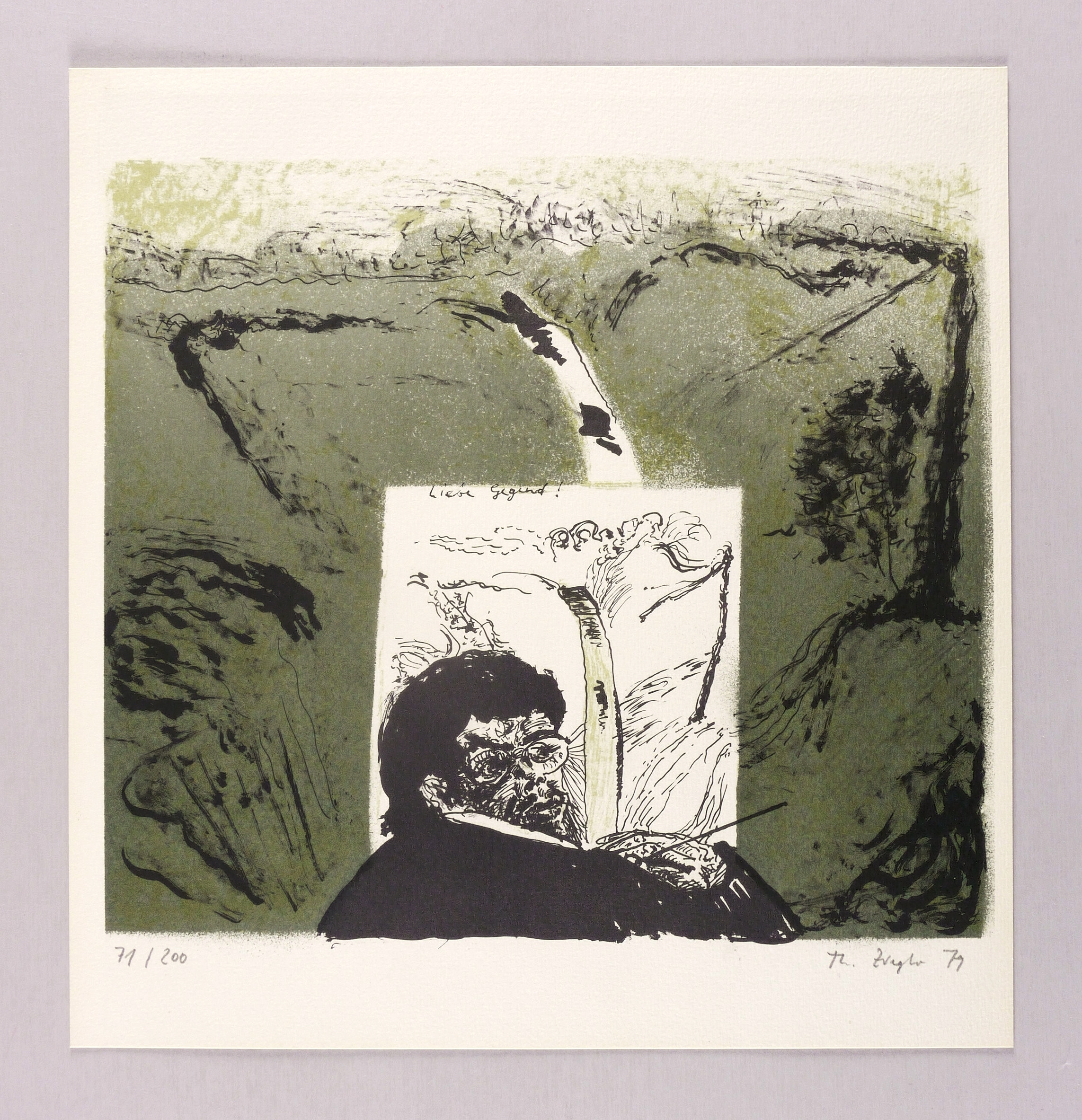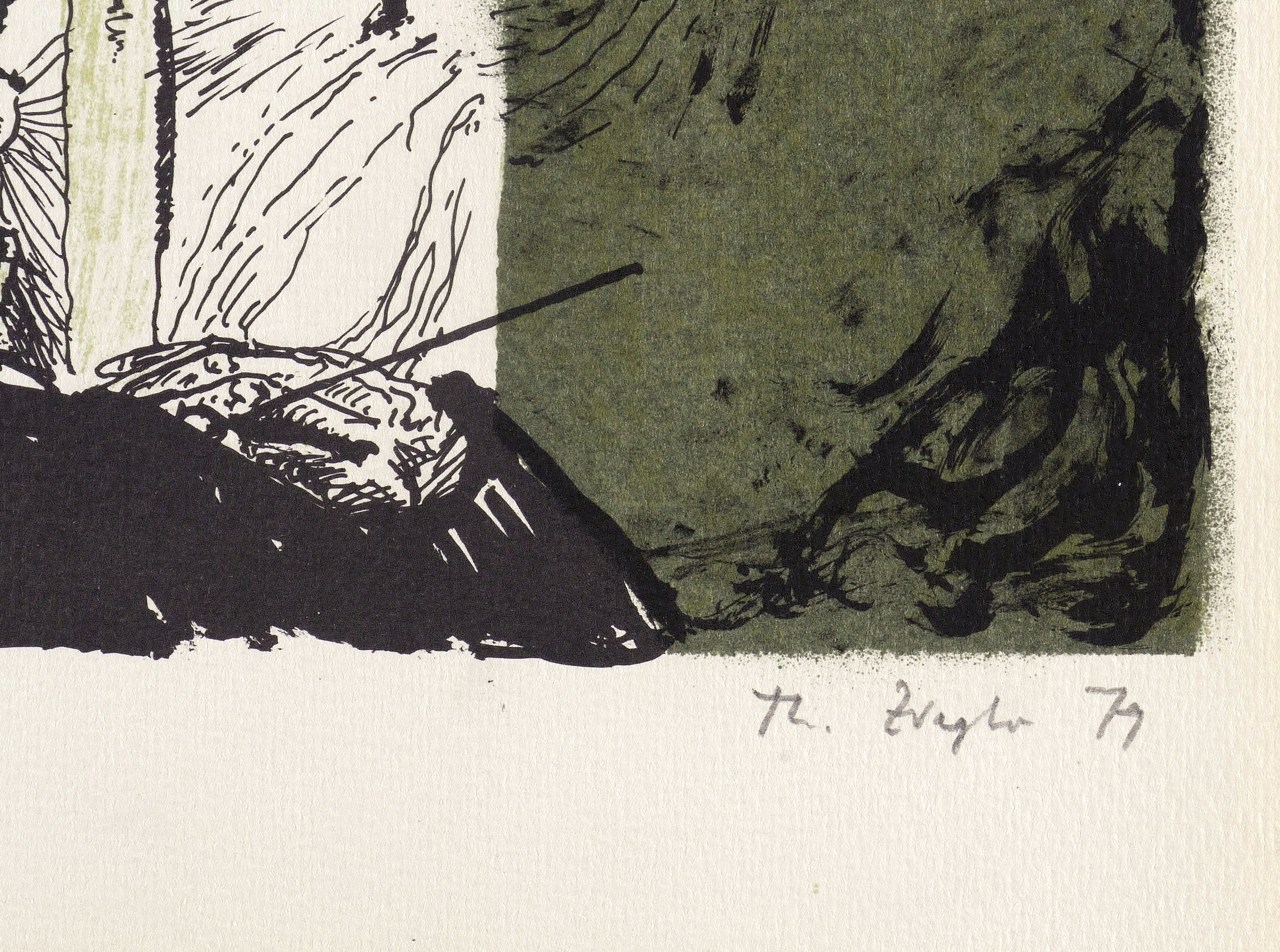 1979. Farboffsetlithografie / Feder- & Pinsellithografie, in Grün & Schwarz, auf hellchamois Weißenborn. – Originale Künstlergrafik, von Thomas Ziegler. – Auflage Exemplar Nr. 71/200. – 29,5 x 33,2 cm (Darstellung / Druckbild), 37 x 35 cm (Blatt).