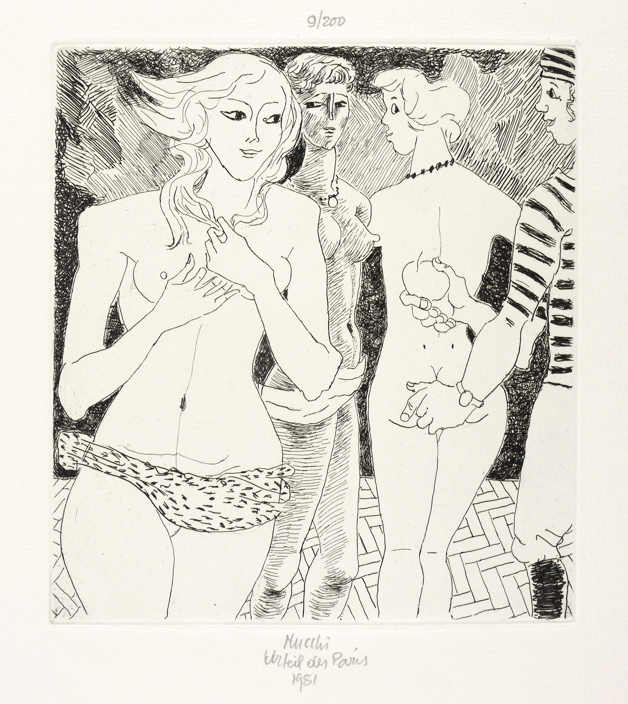 Unterhalb in Bleistift signiert und datiert: ″Mucchi 1981″. Dazu Titel: ″Urteil des Paris″. Oberhalb Auflagenbezeichnung: ″9/200″. – Tadellos. Sehr guter Zustand.