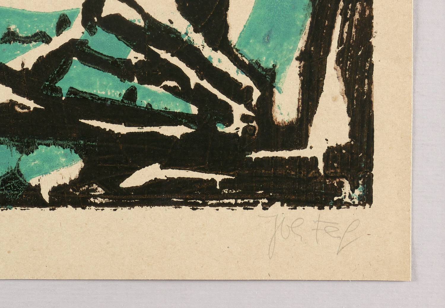 1983. Farbholzschnitt, in Grün & Schwarz, auf glattem gelbem Werkdruck. – Originale Künstlergrafik, von Johannes Feige. – 42,8 x 36,7 cm (Darstellung / Druckstock), 47 x 40 cm (Blatt).