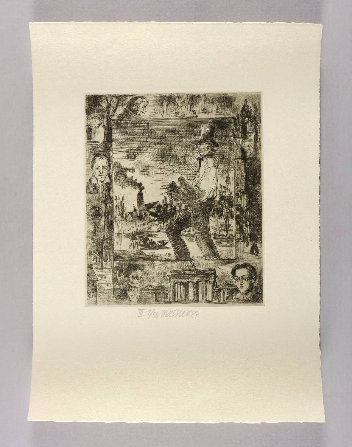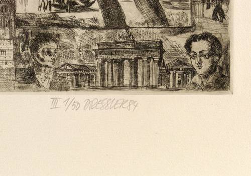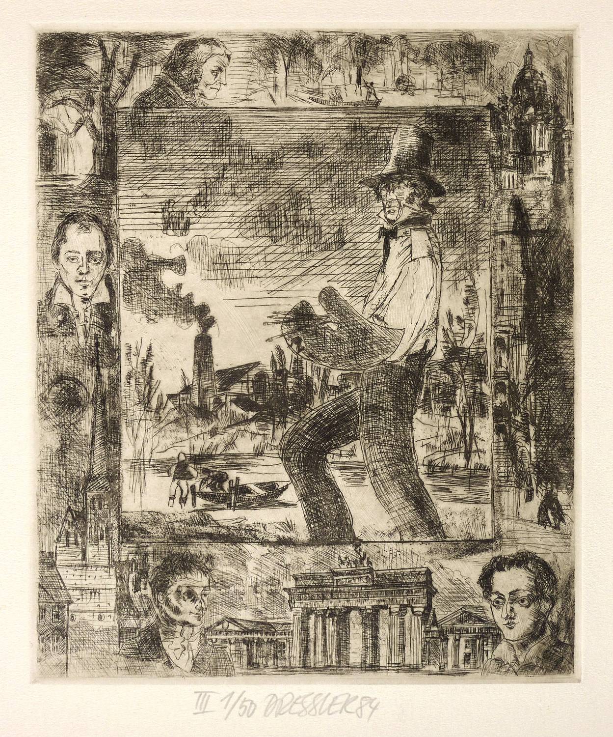 Unterhalb signiert und datiert: ″DRESSLER 84″. Dazu eigenhändige Auflagenbezeichnung: ″III 1/50″. – Unter den Dargestellten rechts unten Heinrich Heine. – Papier leicht gewellt. Sonst ohne Makel. Guter Zustand.