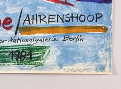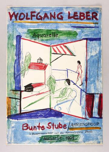 Rechts unten in Bleistift signiert: ″W. Leber″. Links Auflagenbezeichnung: ″25/00″. Im Stein Inschrift. – Originalgrafisches Künstler-Plakat zur Ausstellung ″Wolfgang Leber - Aquarelle″ 1981 in der Bunten Stube in Ahrenshoop, in Zusammenarbeit mit der Nationalgalerie Berlin. – Tadelloses Exemplar.