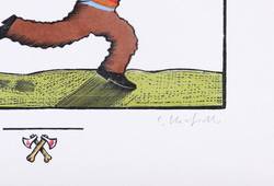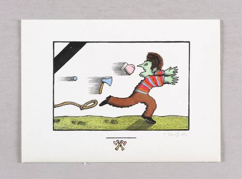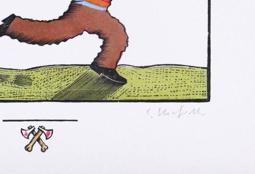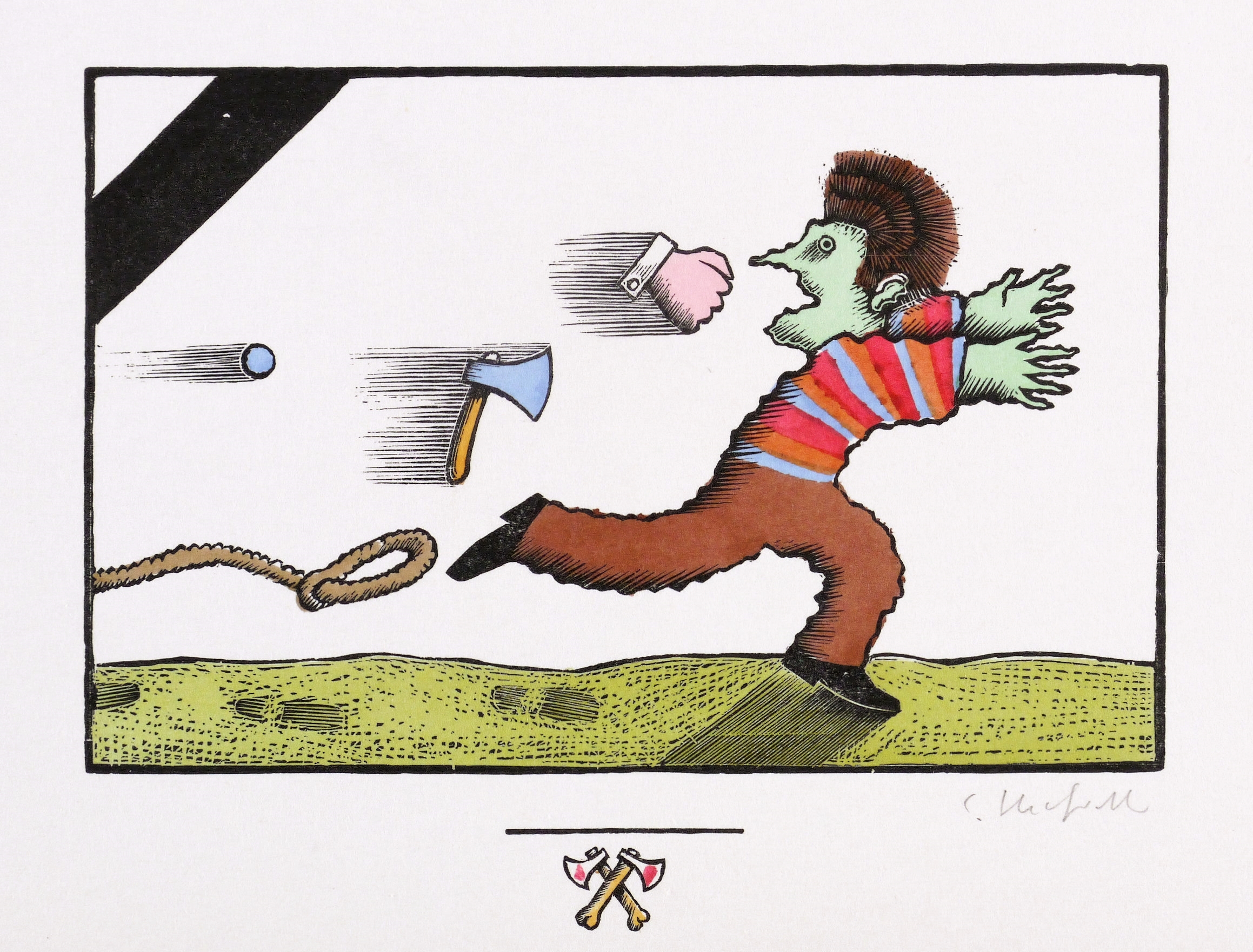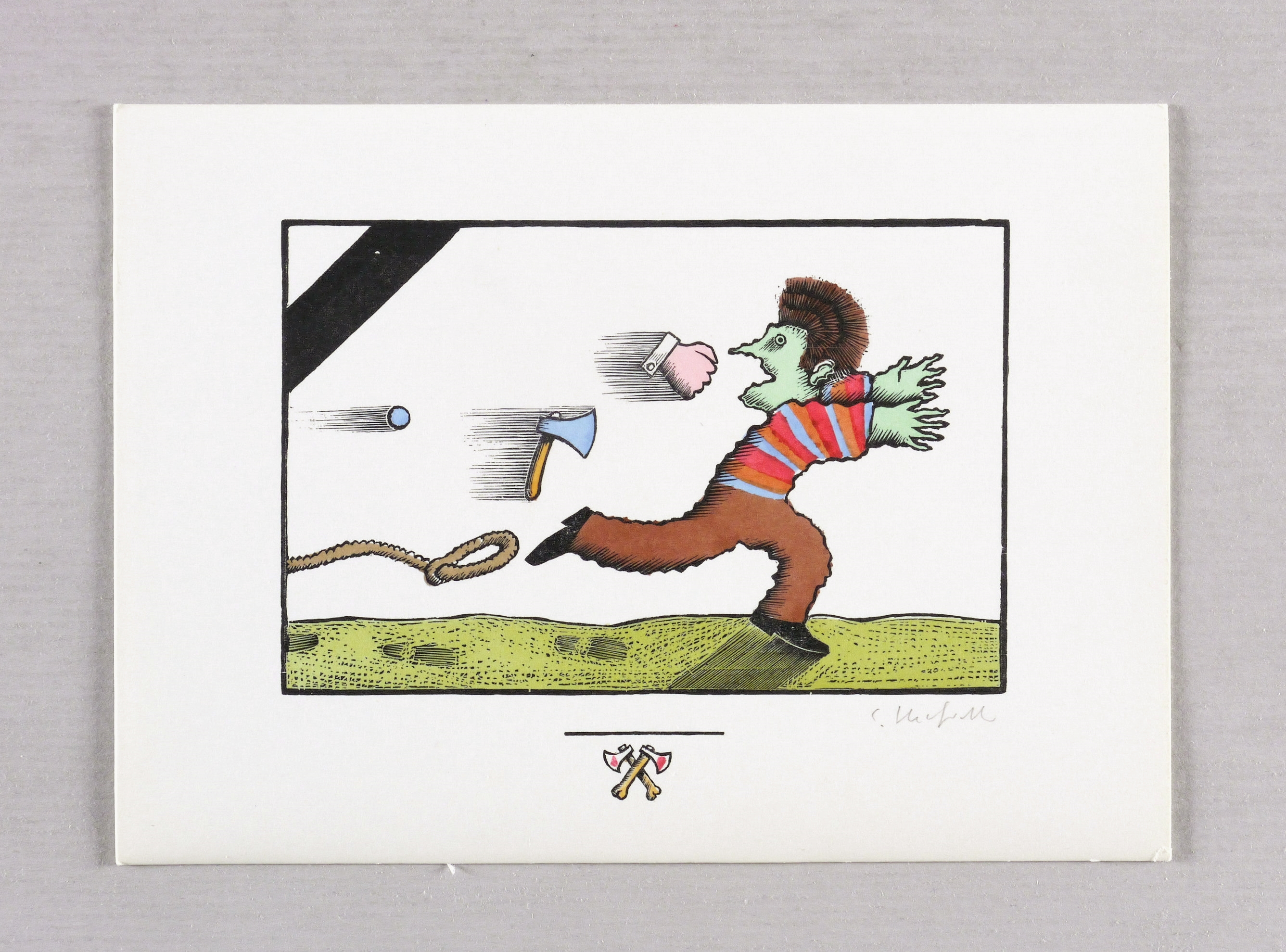 Aus: Johannes Jahn, Der Krimi. Schüttelreime (Leipzig: Hochschule für Grafik und Buchkunst 1972). – Rechts unten in Bleistift signiert: ″E. Herfurth″. – Illustration zu Johannes Jahn ″Der Krimi. Schüttelreime″ (Leipzig: Hochschule für Grafik und Buchkunst 1972). – Sehr guter Zustand.