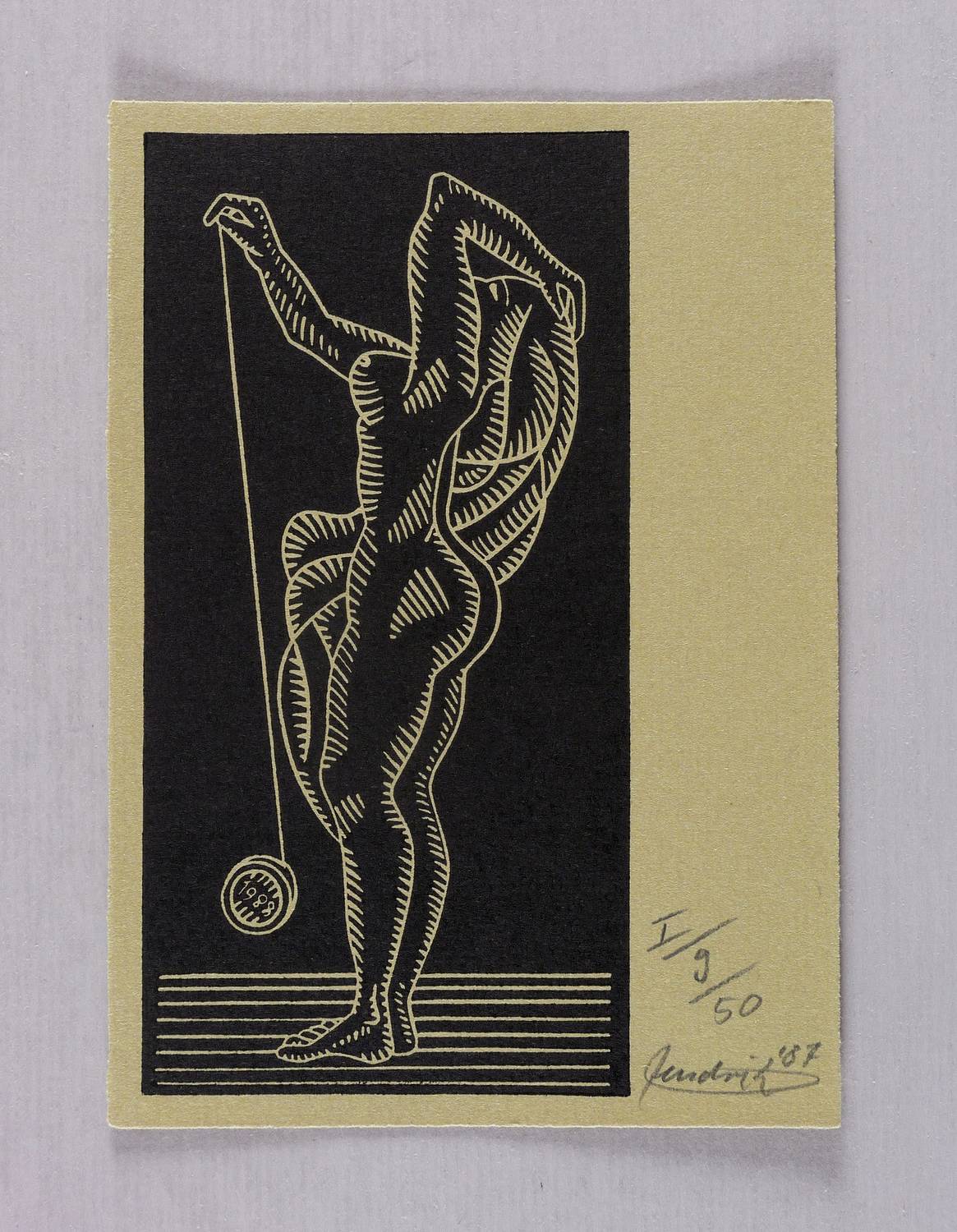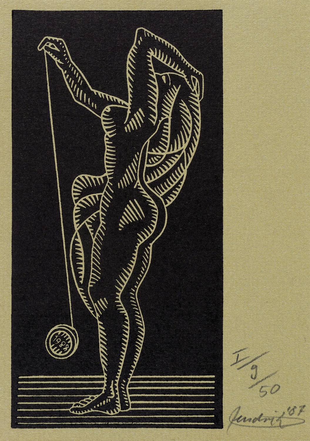 1987. Linolschnitt, in Schwarz, auf graugrün getöntem Hahnemühle. – Originale Künstlergrafik, von Hendrik Hause. – Auflage Exemplar Nr. 9/50. – 14,9 x 7,5 cm (Darstellung / Druckbild), 16 x 12 cm (Blatt).