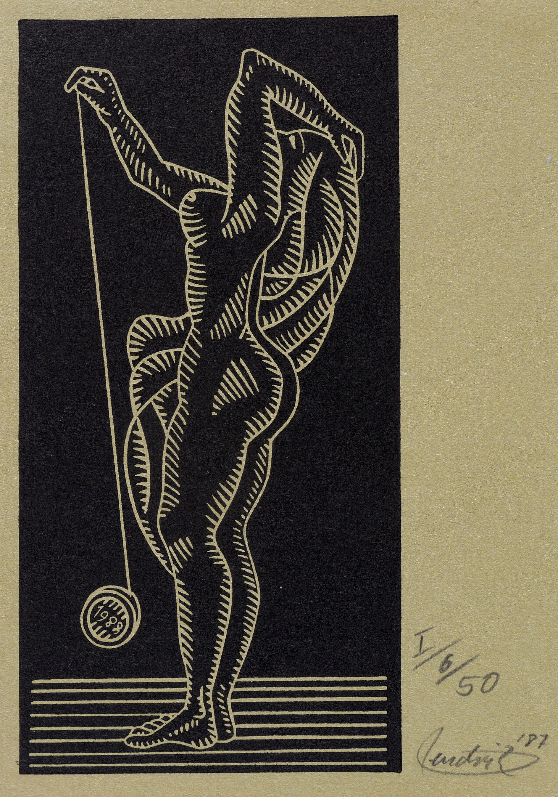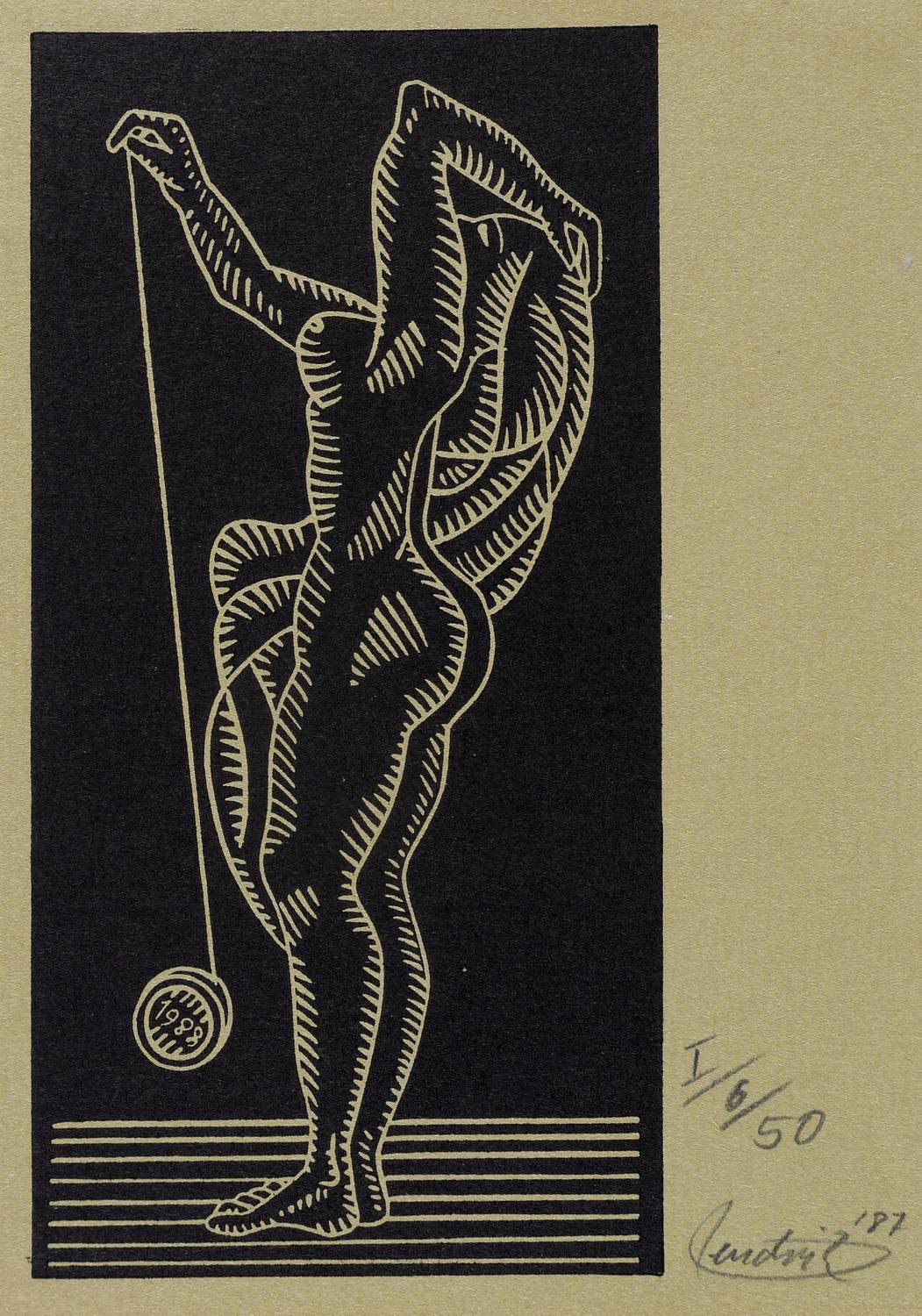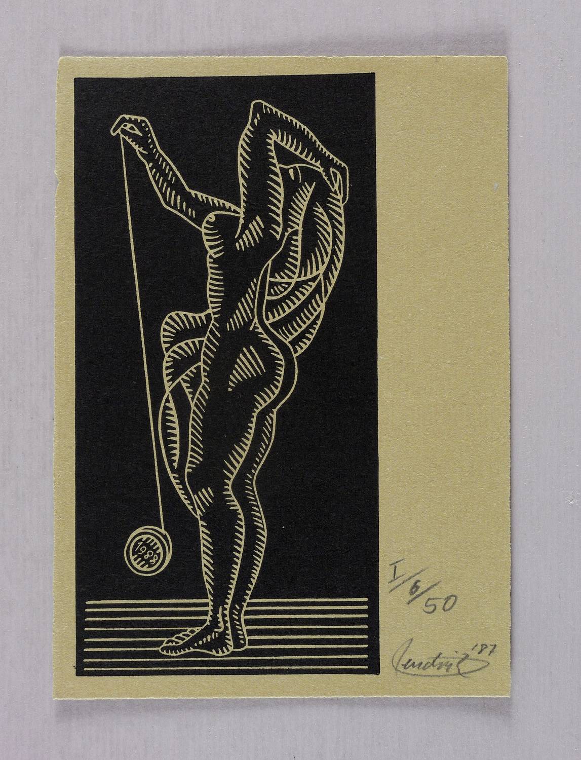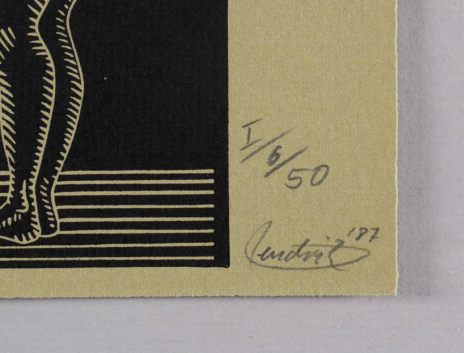 1987. Linolschnitt, in Schwarz, auf graugrün getöntem Hahnemühle. – Originale Künstlergrafik, von Hendrik Hause. – Auflage Exemplar Nr. 6/50. – 14,9 x 7,5 cm (Darstellung / Druckbild), 16 x 12 cm (Blatt).