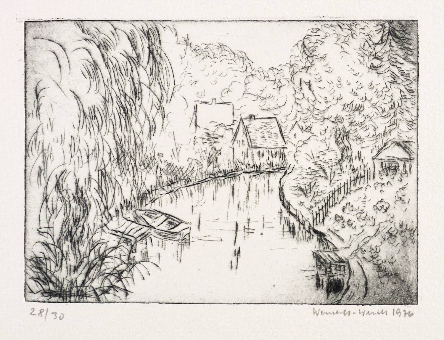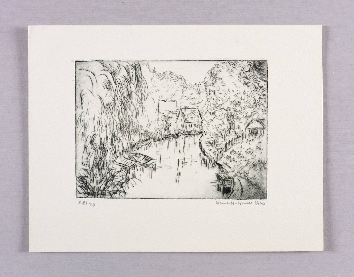 1976. Radierung / Strichätzung, in Schwarz, auf hartem hellchamois Weißenborn. – Originale Künstlergrafik, von Ursula Wendorf-Weidt. – Auflage Exemplar Nr. 28/30. – 9,2 x 12,8 cm (Darstellung / Platte), 16 x 20 cm (Blatt).