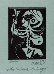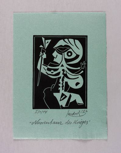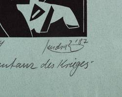 Rechts unten in Bleistift signiert und datiert: ″hendrik 87″. Links Auflagenbezeichnung: ″I/1/14″. Mittig darunter Titel: ″Narrentanz des Krieges″. – Sehr guter Zustand.