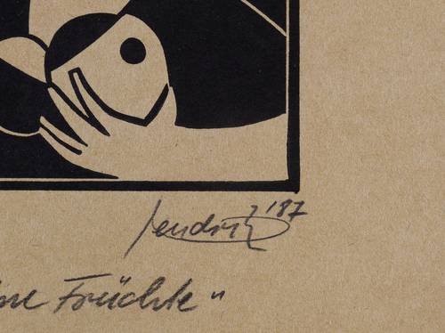 Rechts unten in Bleistift signiert und datiert: ″hendrik 87″. Links Auflagenbezeichnung: ″I/1/120″. Mittig darunter Titel: ″schöne Früchte″. – Sehr guter Zustand.