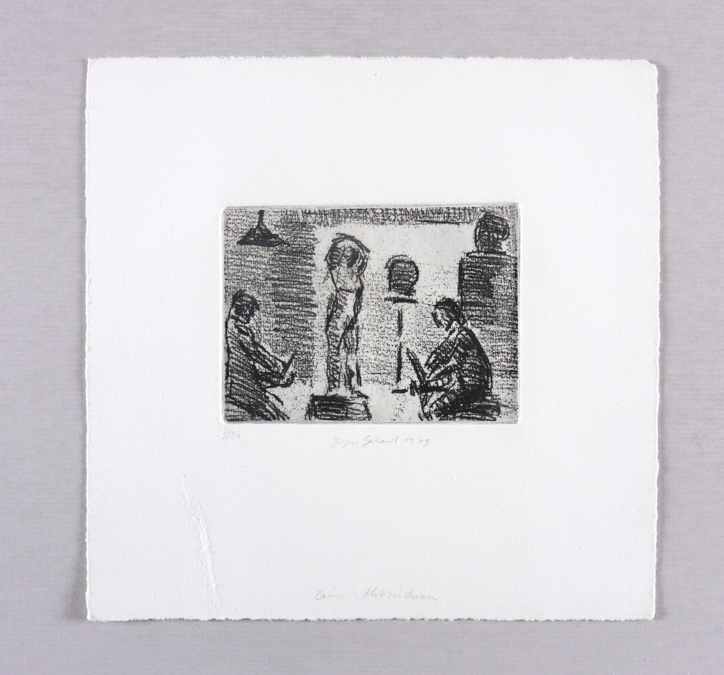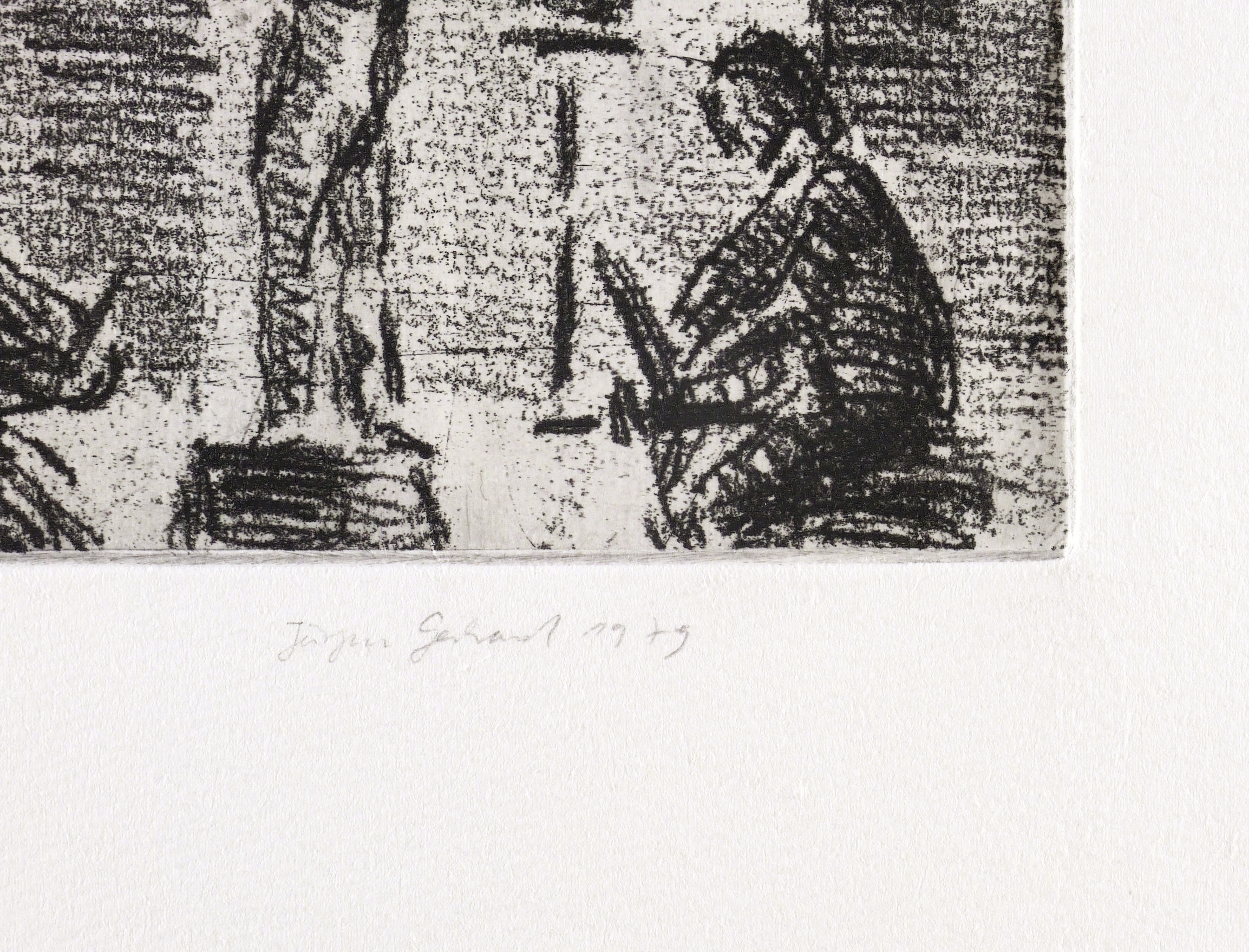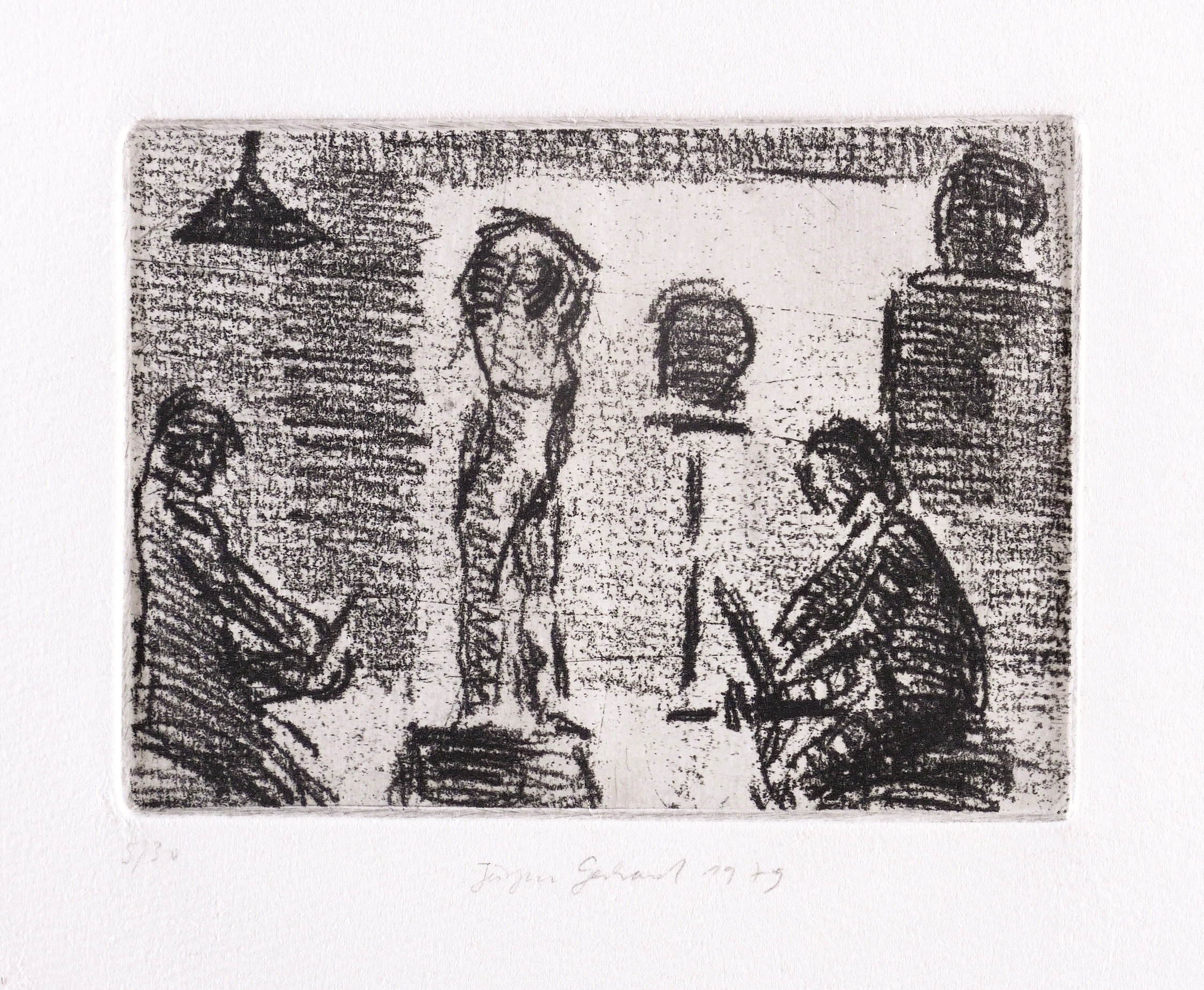Unterhalb in Bleistift signiert und datiert: ″Jürgen Gerhard 1979″. Links eigenhändige Auflagenbezeichnung: ″5/30″. Im Blattrand unten Titel: ″Beim Aktzeichnen″. – Kratzspur im unteren Blattrand links (weit außerhalb der Darstellung). Guter Zustand.