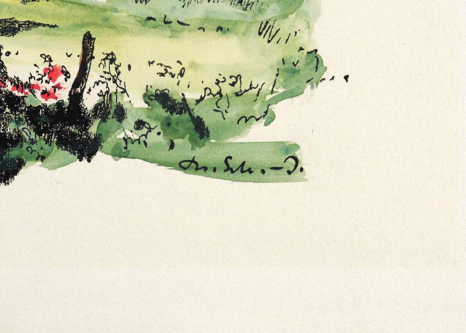 Um 1950. Lithografie / Pinsellithografie, in Schwarz, aquarelliert, auf leichtem hellchamois Velin. – Originale Künstlergrafik, von Theodor Schultze-Jasmer. – Unikat. – 13,5 x 20,0 cm (Darstellung / Druckbild), 21 x 26 cm (Blatt).