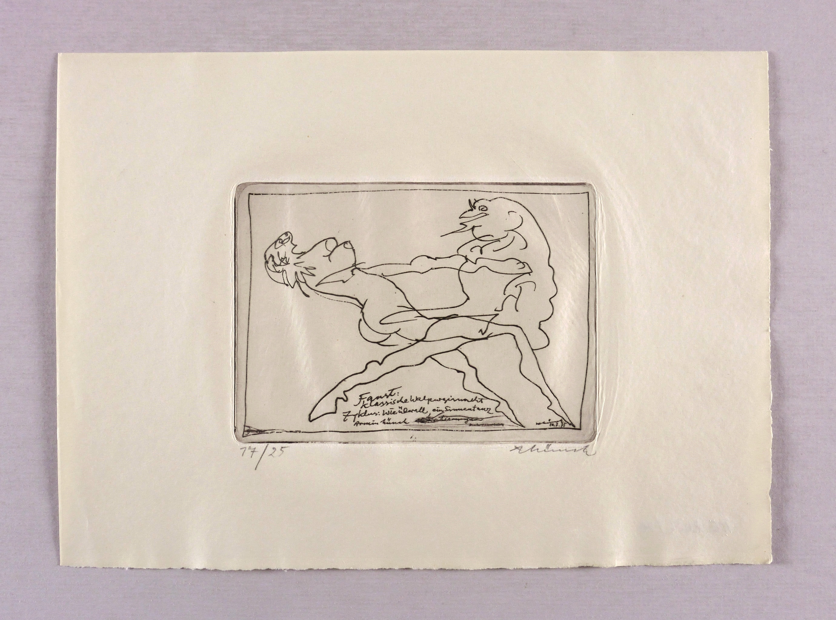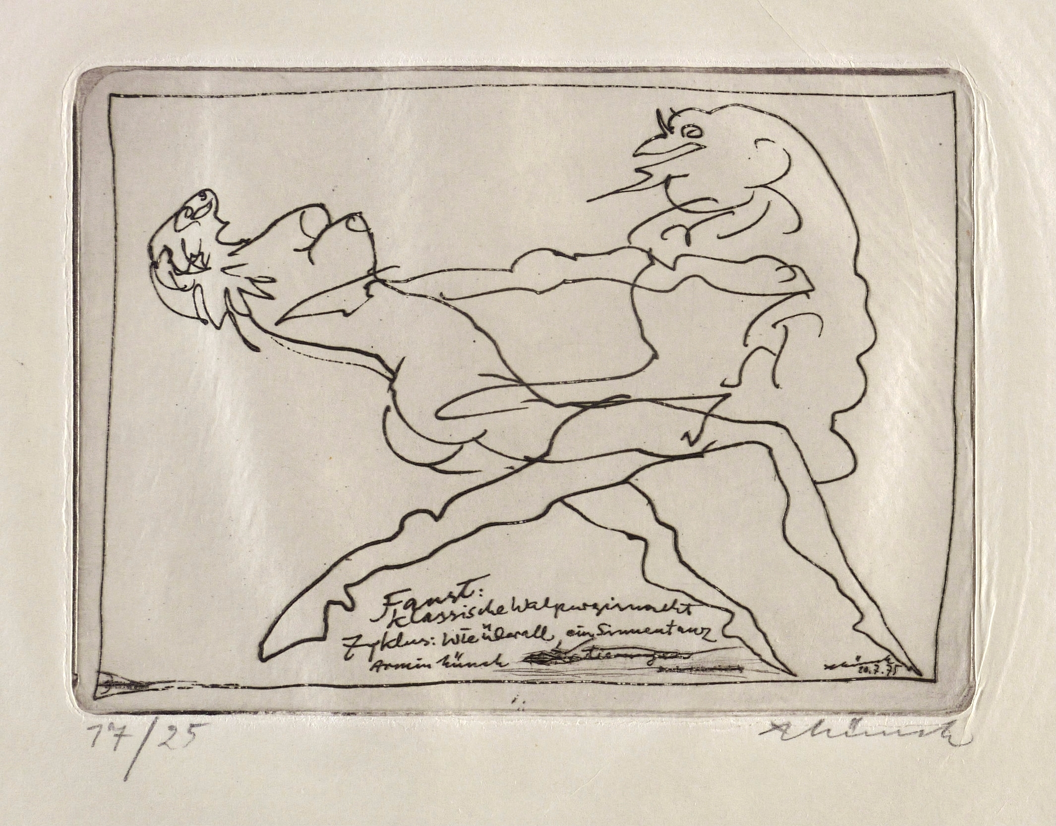 Rechts unten in Bleistift signiert: ″AMünch″. Links Auflagenbezeichnung: ″17/25″. In der Platte rechts unten zusätzlich Signatur und Datum: ″Münch 20.7.75″. Links Inschrift: ″Faust: Klassische Walpurgisnacht / Zyklus: Wie überall ein Sinnentanz / Armin Münch″. – Tadellos. Sehr guter Zustand.