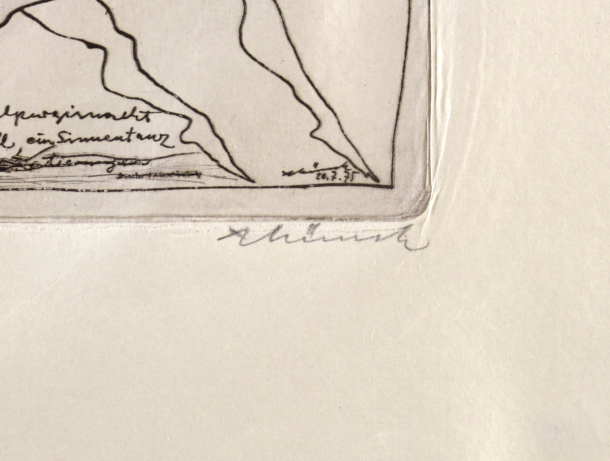 1975. Radierung / Strichätzung, in Schwarz, auf feinstem chamois Japan. – Originale Künstlergrafik, von Armin Münch. – Auflage Exemplar Nr. 17/25. – 10,4 x 14,3 cm (Darstellung / Platte), 21 x 29 cm (Blatt).