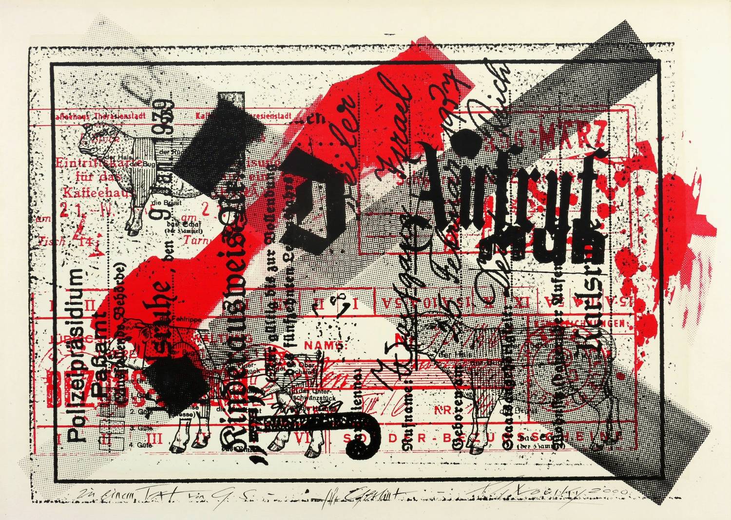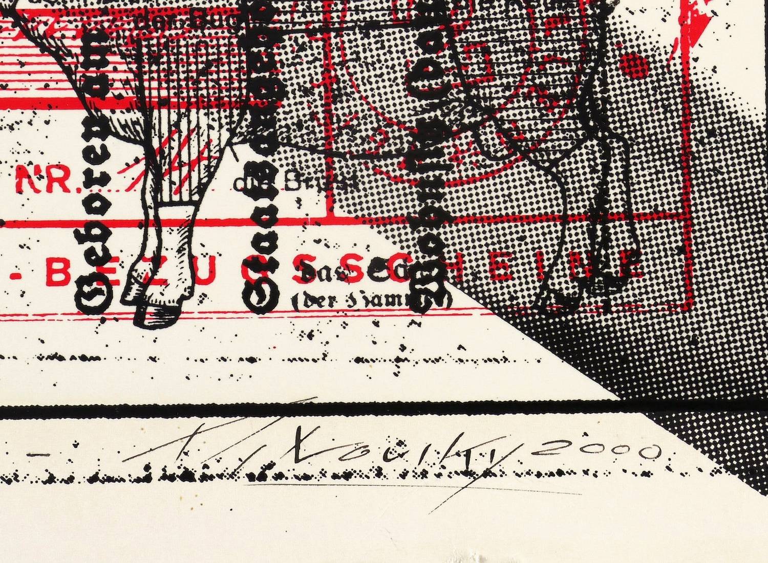 2000. Farbsiebdruck / Farbserigrafie, mit Fotomontage, in Rot & Schwarz, auf kräftigem Velinkarton. – Originale Künstlergrafik, von Wolfgang Petrovsky. – 27,5 x 38,6 cm (Darstellung / Druckbild), 30 x 43 cm (Blatt).