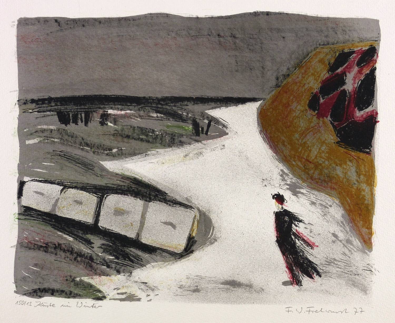 Rechts unten in Bleistift signiert und datiert: ″F.W. Fretwurst 77″. Links Auflagenbezeichnung und Titel: ″150/13 // Küste im Winter″. – Sehr guter Zustand.