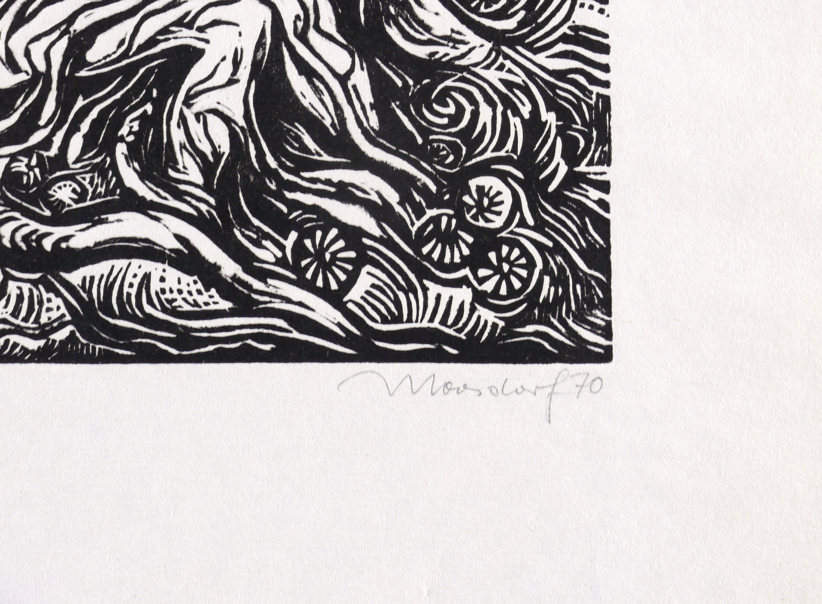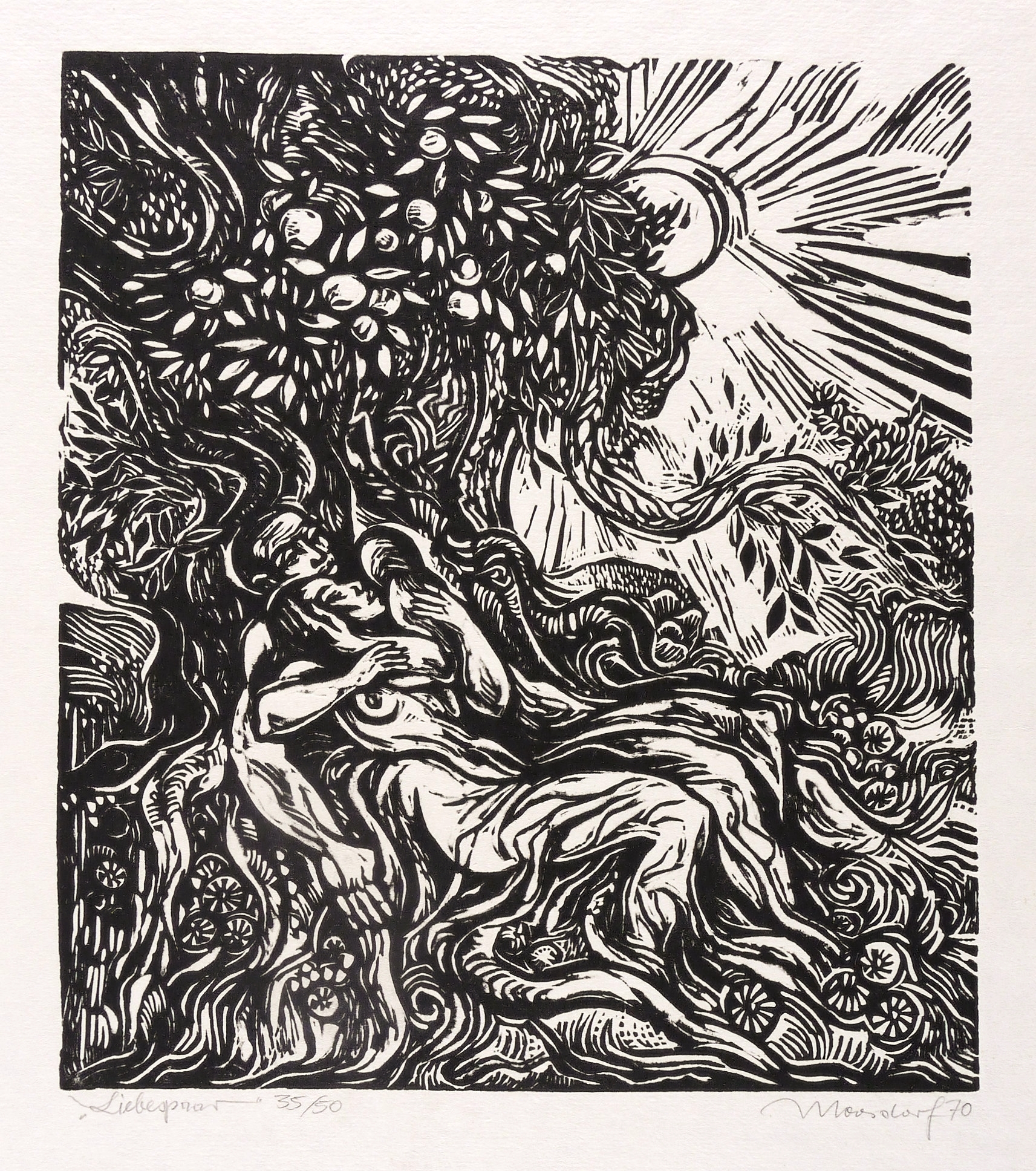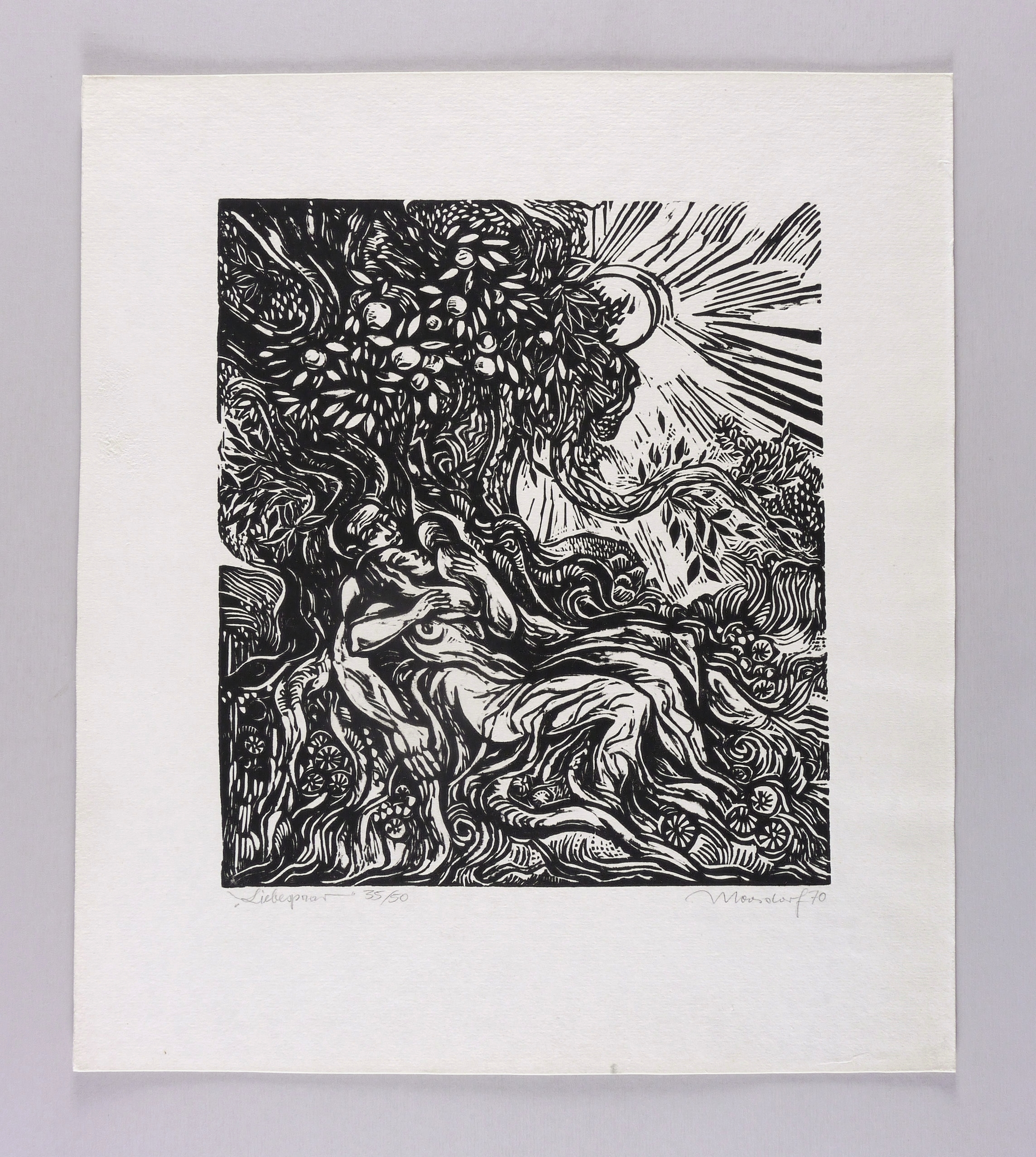 Rechts unten in Bleistift signiert und datiert: ″Moosdorf 70″. Links Titel und Auflagenbezeichnung: ″Liebespaar // 35/50. – Sehr guter Zustand.