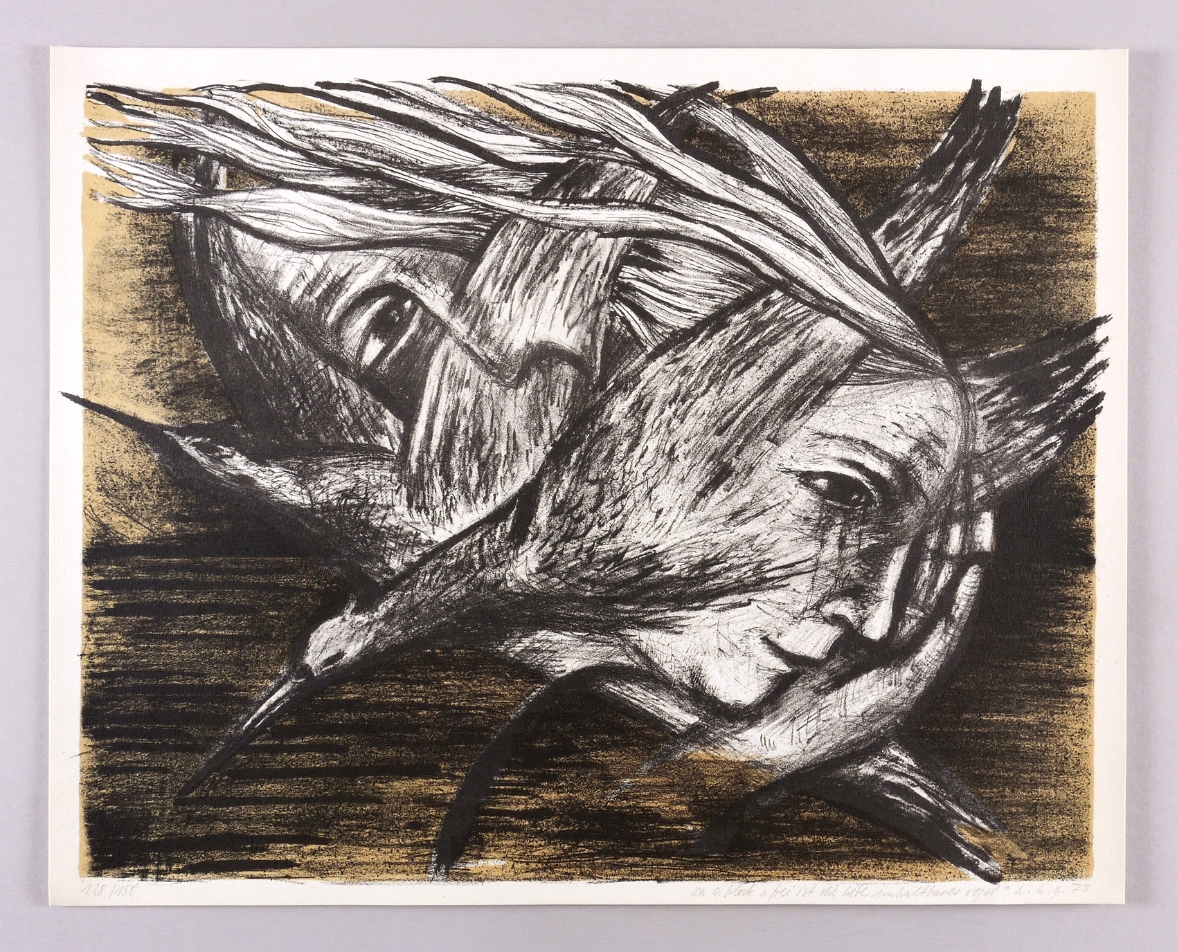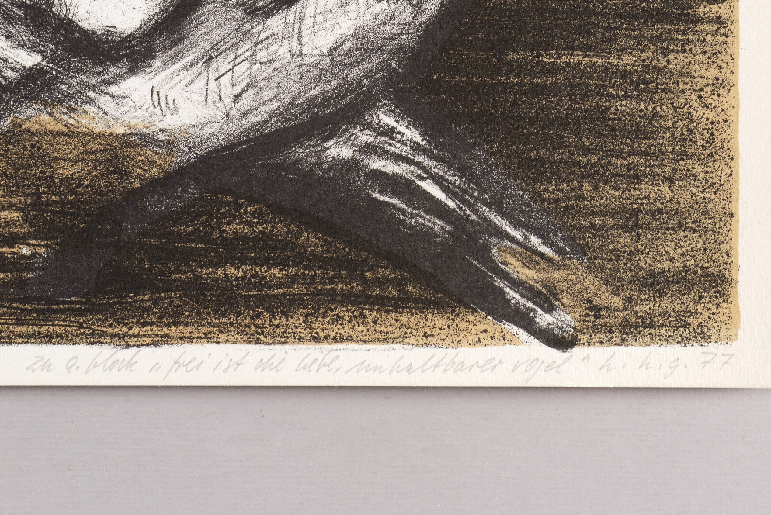 Rechts unten in Bleistift signiert und datiert: ″h.h.g. 77″. Daneben Titel: ″zu a. blok 'frei ist die liebe, unhaltbarer vogel'″. Links eigenhändige Auflagenbezeichnung: ″128/150″. – Sehr guter Zustand.