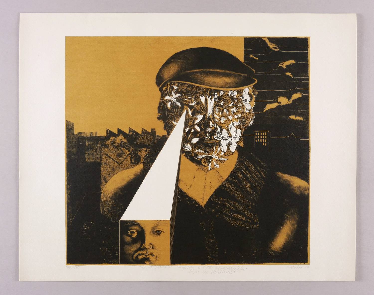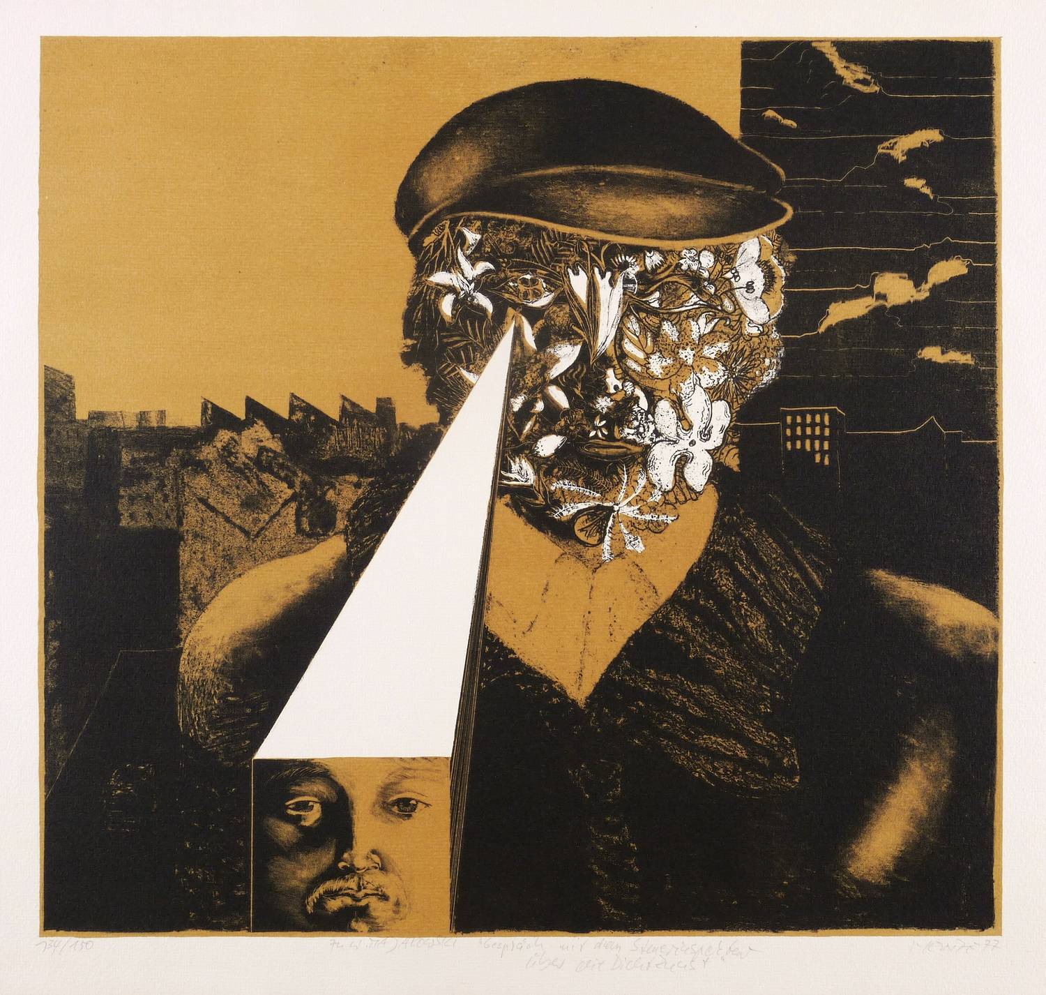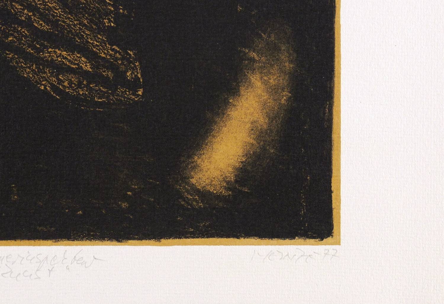 1977. Farblithografie / Kreide-, Feder- & Pinsellithografie, in Ocker & Schwarz, auf hellchamois Weißenborn. – Originale Künstlergrafik, von Frieder Heinze. – Auflage Exemplar Nr. 134/150. – 40,9 x 43,8 cm (Darstellung / Druckbild), 48 x 60 cm (Blatt).