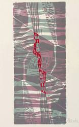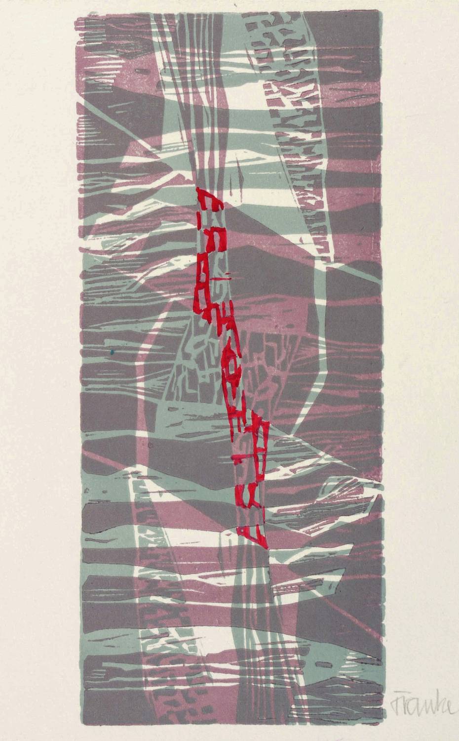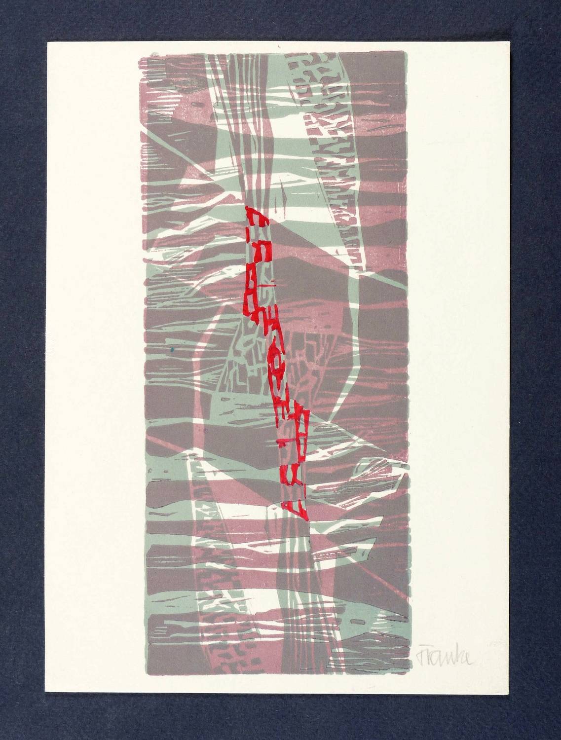 Um 1970. Farblinolschnitt, in 3 Farben, auf weißem Karton. – Originale Künstlergrafik, von Rudolf Franke. – 20,1 x 8,6 cm (Darstellung / Druckstock), 22 x 15 cm (Blatt).