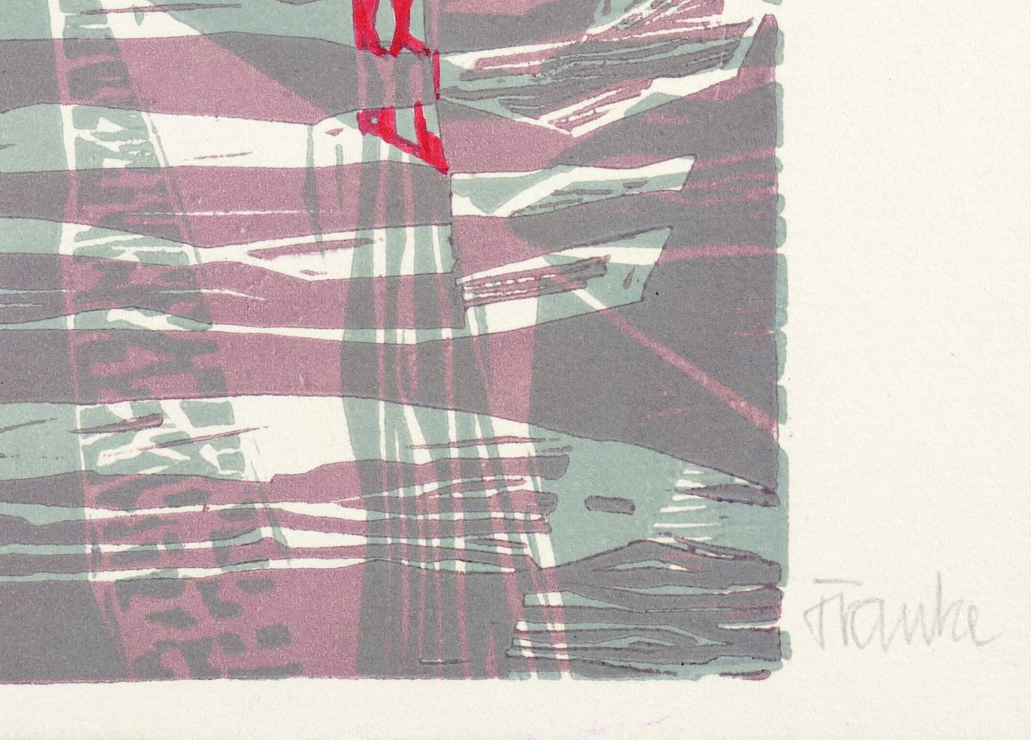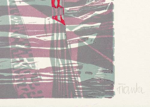 Rudolf Franke (1925 Erfurt - 2002 Erfurt). Deutscher Grafiker und Grafiksammler. Ende 1940er Jahre Studium zum Gebrauchsgrafiker an der Hochschule für Grafik und Buchkunst Leipzig (HGB) unter Walter Arnold. Danach in Erfurt als Gebrauchsgrafiker und freier Grafiker tätig. 1960-90 Lehrtätigkeit am Pädagogischen Institut, später der Pädagogischen Hochschule Erfurt. 1963-74 führendes Mitglied der Erfurter Ateliergemeinschaft. Suchte für den Ausdruck seiner im Thüringer Wald, in der Tatra oder nach 1989 z.B. in den Alpen gewonnenen Landschaftserfahrung v.a. im Farblinolschnitt eine sensibel abstrahierte Bildform.