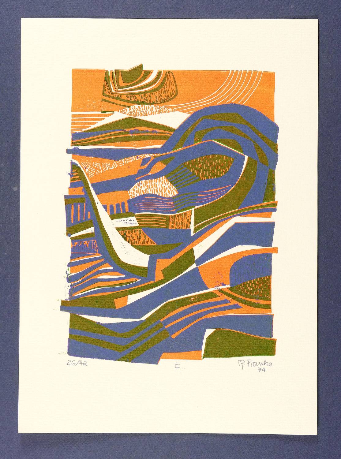 1974. Farblinolschnitt, in 3 Farben, auf Weißenborn-Büttenkarton. – Originale Künstlergrafik, von Rudolf Franke. – Auflage Exemplar Nr. 26/42. – 23,3 x 17,0 cm (Darstellung / Druckstock), 32 x 23 cm (Blatt).
