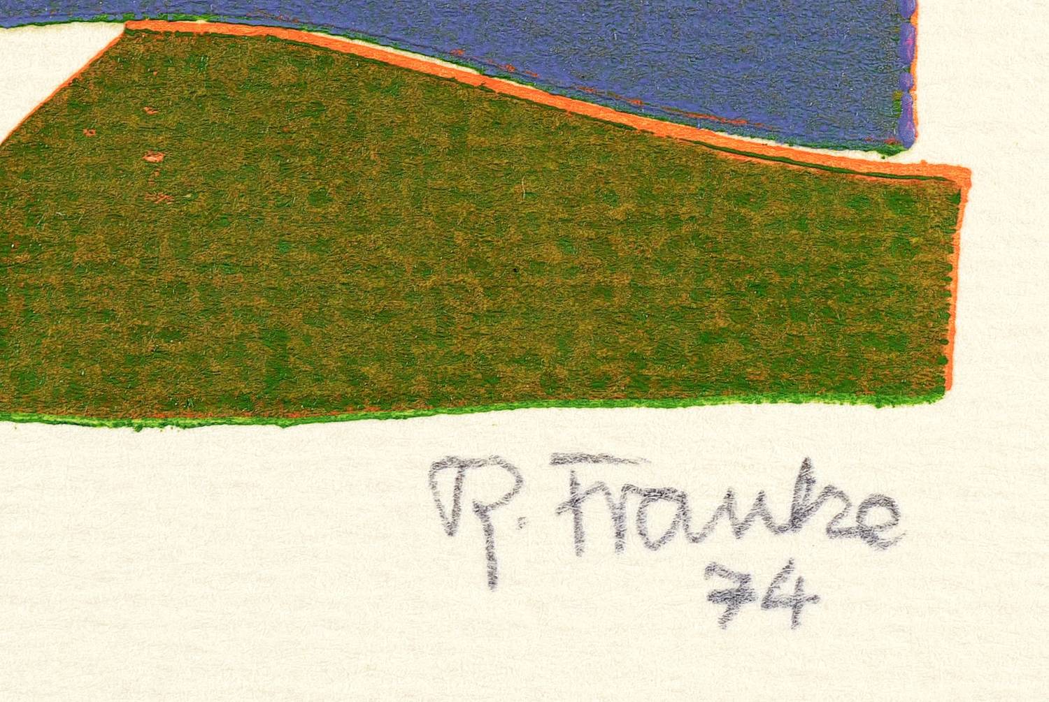 Rudolf Franke (1925 Erfurt - 2002 Erfurt). Deutscher Grafiker und Grafiksammler. Ende 1940er Jahre Studium zum Gebrauchsgrafiker an der Hochschule für Grafik und Buchkunst Leipzig (HGB) unter Walter Arnold. Danach in Erfurt als Gebrauchsgrafiker und freier Grafiker tätig. 1960-90 Lehrtätigkeit am Pädagogischen Institut, später der Pädagogischen Hochschule Erfurt. 1963-74 führendes Mitglied der Erfurter Ateliergemeinschaft. Suchte für den Ausdruck seiner im Thüringer Wald, in der Tatra oder nach 1989 z.B. in den Alpen gewonnenen Landschaftserfahrung v.a. im Farblinolschnitt eine sensibel abstrahierte Bildform.