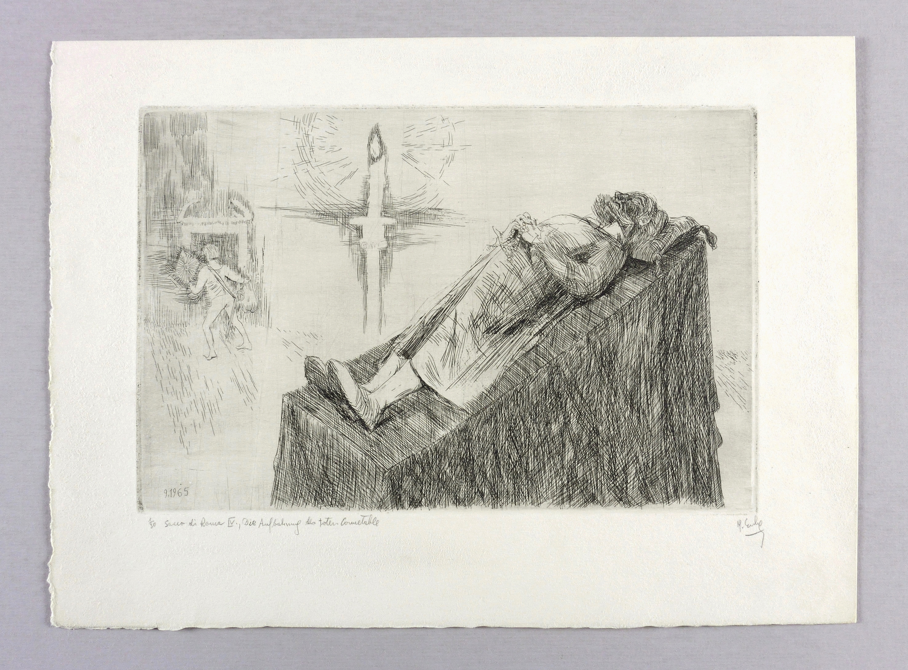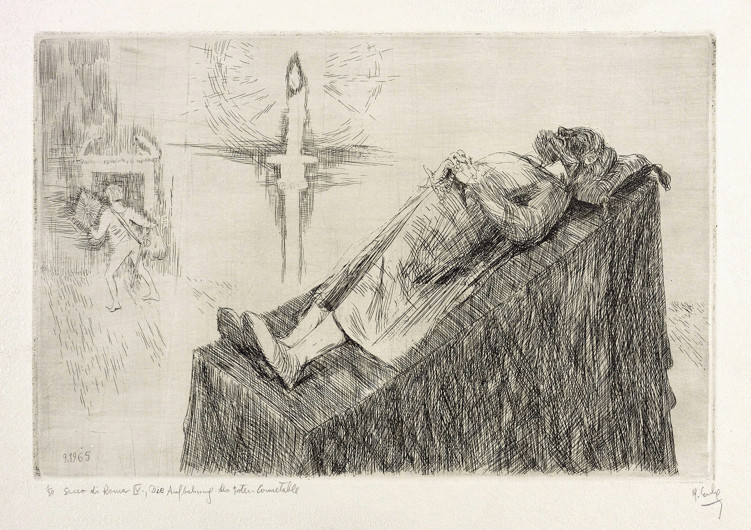 Rechts unten in Bleistift signiert: ″H. Escher″. Links Auflagenbezeichnung: ″1/30″. Dazu Titel: ″Sacco di Roma IV. / Die Aufbahrung des toten Connetable″. In der Platte links unten datiert: ″9.1965″. – Provenienz: Sammlung Erhard Frommhold, Dresden. Frommhold war Cheflektor und Verlagsleiter des Verlag der Kunst in Dresden. – Sehr guter Zustand.