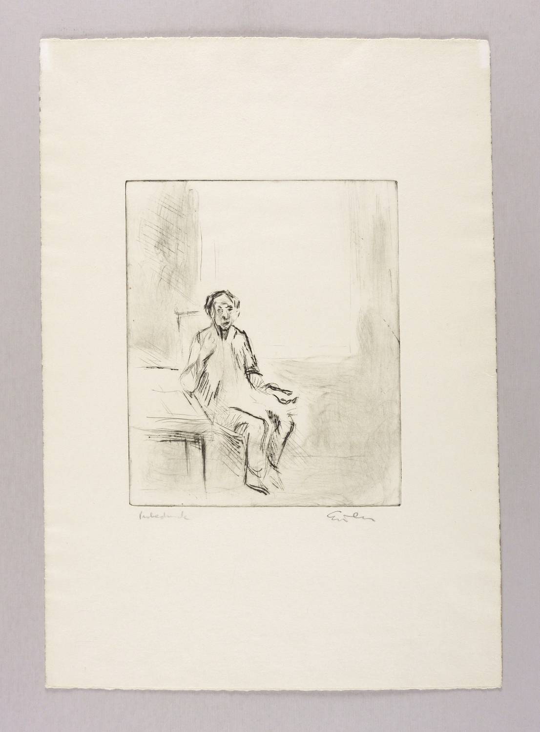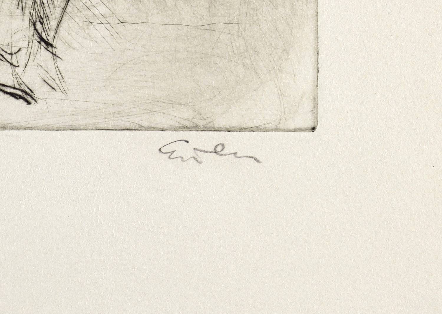 Rechts unten in Bleistift signiert: ″Eisler″. Links Auflagenbezeichnung: ″Probedruck″. Wasserzeichen von BFK Rives. – Provenienz: Sammlung Erhard Frommhold, Dresden. – Frommhold sagte zu Eislers Bildnis-Kunst einst: ″Eisler versucht die Individualität seiner Modelle durch eine betont verhaltene, aber doch bewußt gemachte Gestik und durch räumliche Verfremdung herauszustellen. (...) Die Persönlichkeit wird durch den Raum, in dem er sie einschließt, besonders in ihrer Partikularität erfaßt (...) Gestalt, Physiognomie, Gestik und Raum verschmelzen miteinander.″ – Sehr guter Zustand.