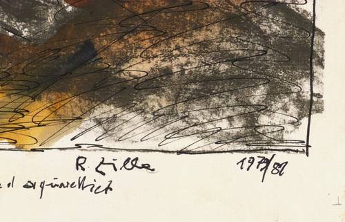 1979/1982. Mischtechnik / Aquarell & Tusche, über Offsetlithografie, auf hellchamois Velin. – Originale Künstlergrafik, von Rainer Zille. – Unikat. – 32,0 x 30,0 cm (Darstellung), 37 x 31 cm (Blatt).