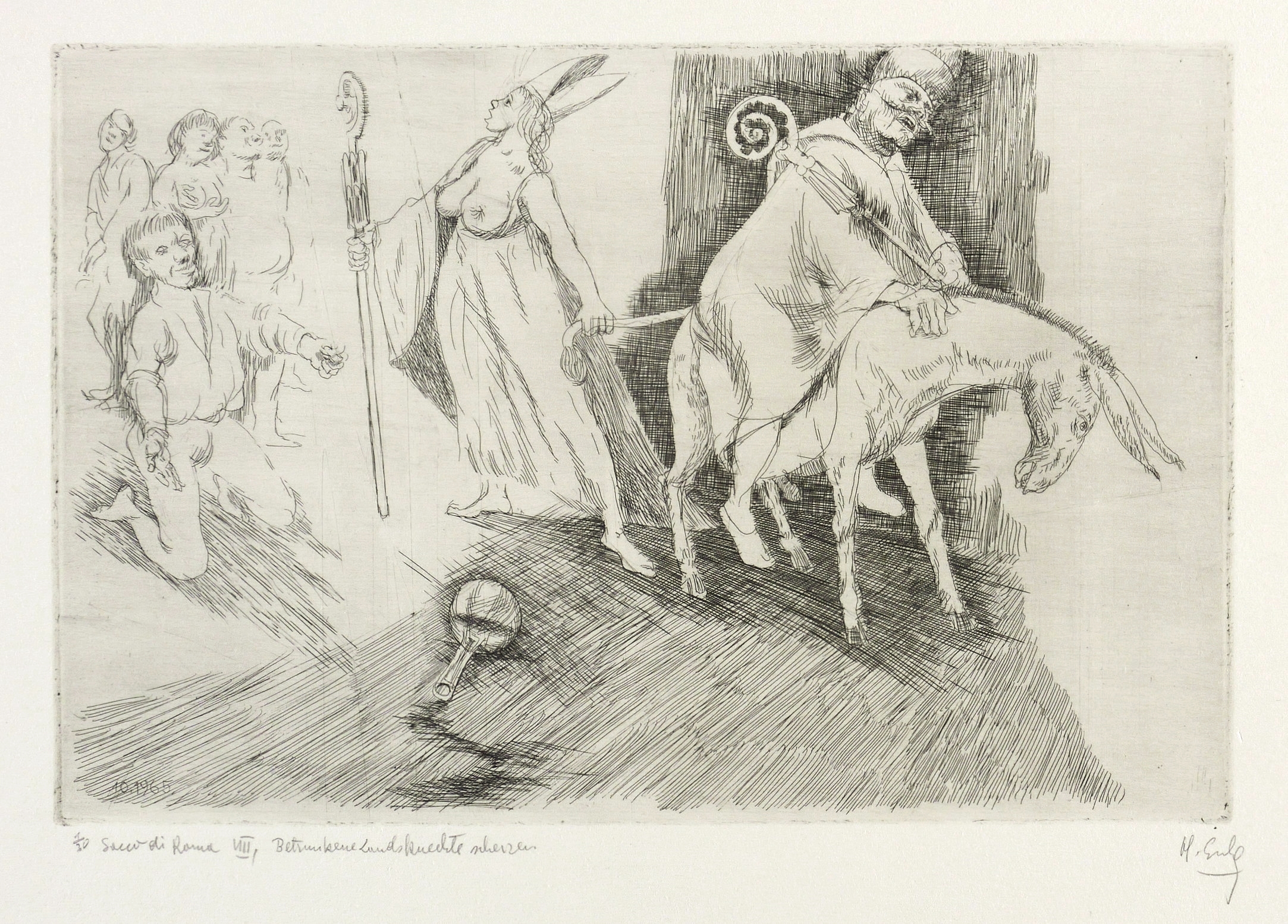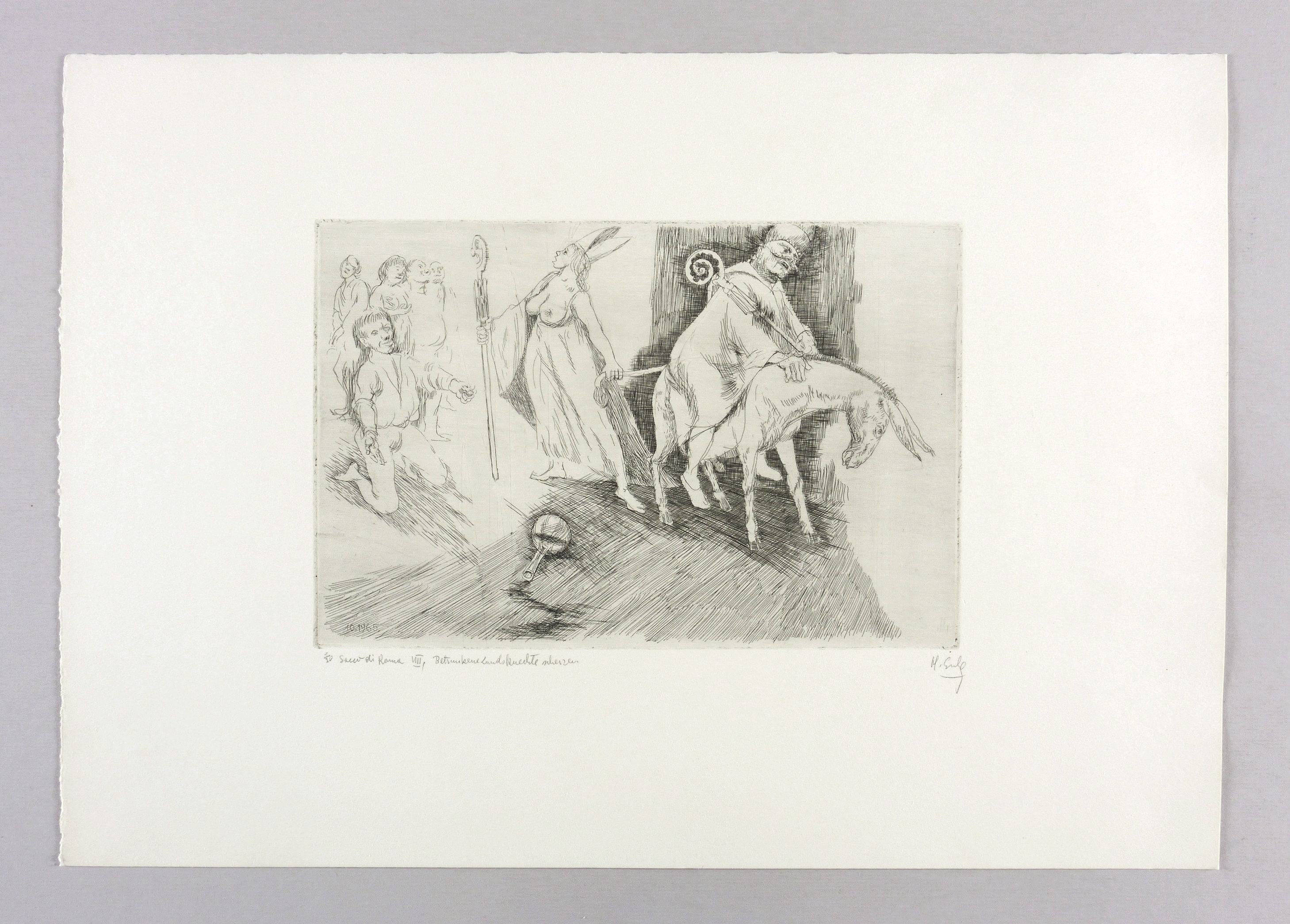 Rechts unten in Bleistift signiert: ″H. Escher″. Links Auflagenbezeichnung: ″1/30″. Dazu Titel: ″Sacco di Roma VIII, Betrunkene Landsknechte scherzen″. In der Platte links unten datiert: ″10.1965″. – Provenienz: Sammlung Erhard Frommhold, Dresden. Frommhold war Cheflektor und Verlagsleiter des Verlag der Kunst in Dresden. – Sehr guter Zustand.
