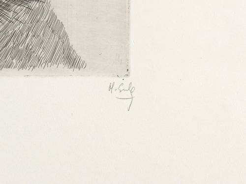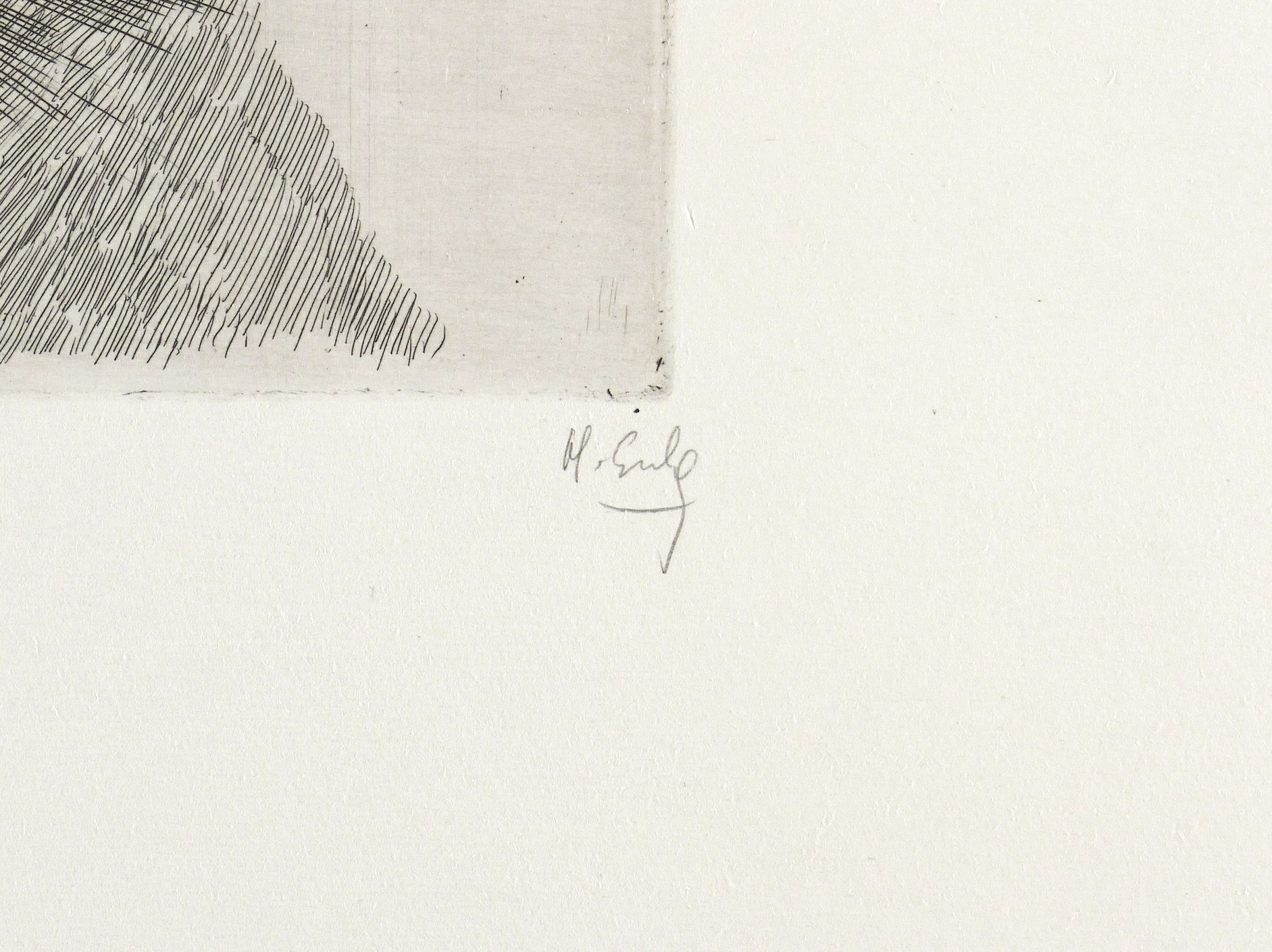 1965. Radierung / Strichätzung, in Schwarz, auf hellchamois Velinkarton. – Originale Künstlergrafik, von Hans Escher. – Auflage Exemplar Nr. 1/30. – 19,8 x 29,8 cm (Darstellung / Platte), 38 x 54 cm (Blatt).