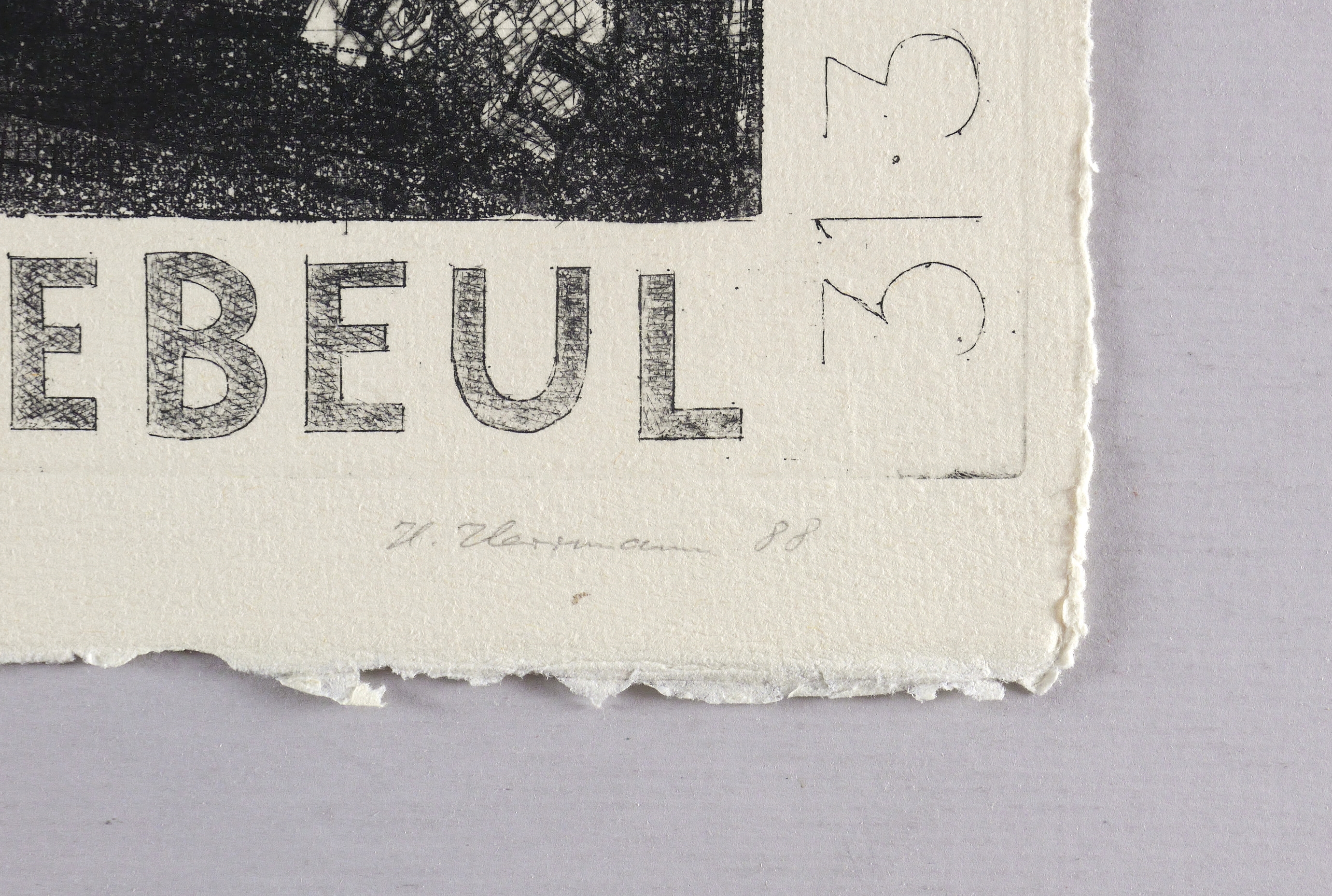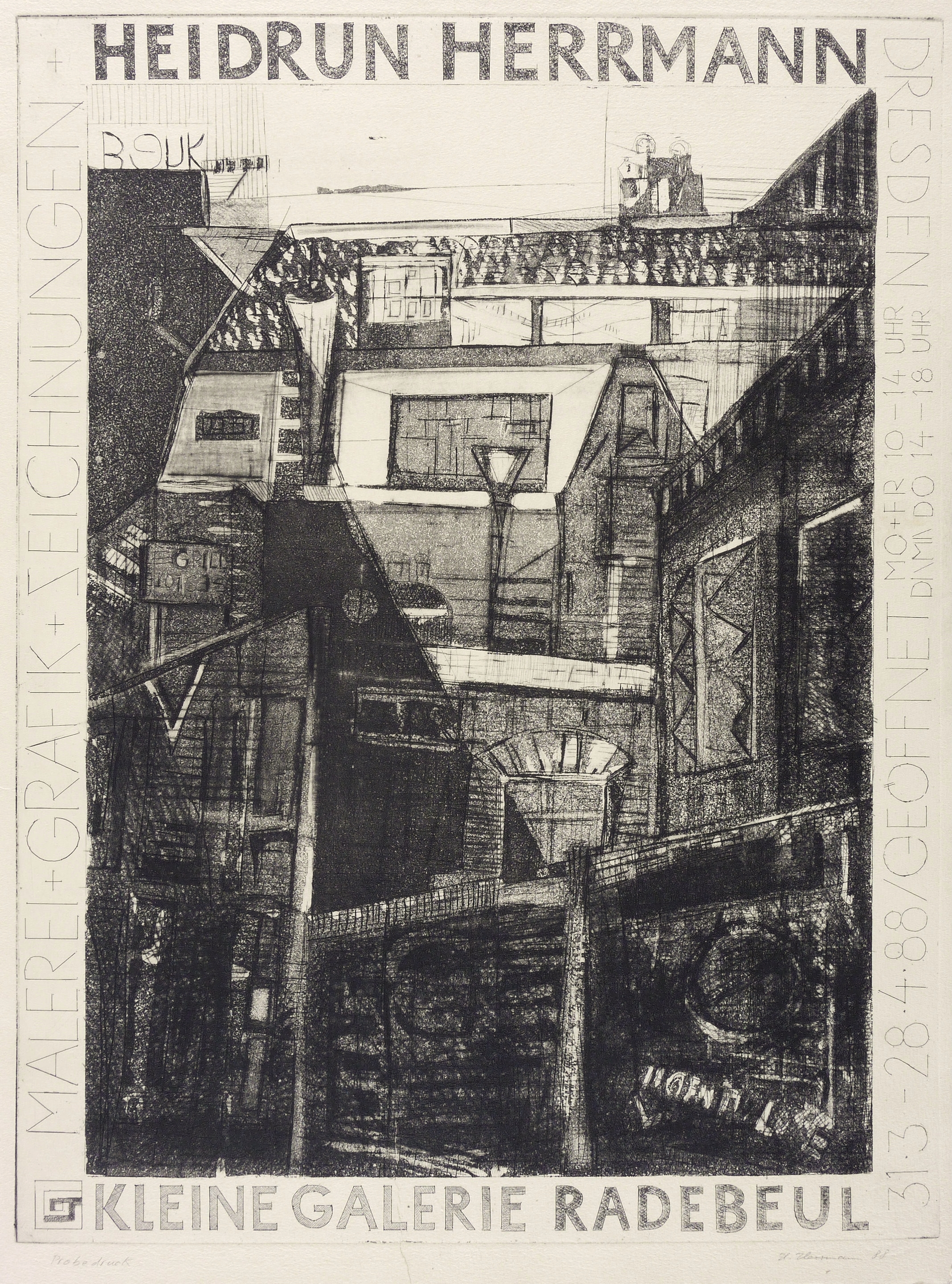 Rechts unten in Bleistift signiert und datiert: ″H. Herrmann 88″. Links eigenhändige Auflagenbezeichnung: ″Probedruck″. – Originalgrafisches Plakat zur Ausstellung ″Heidrun Herrmann. Malerei, Grafik, Zeichnungen″ in der Kleinen Galerie in Radebeul 31.3.-28.4.1988. – Sehr guter Zustand.