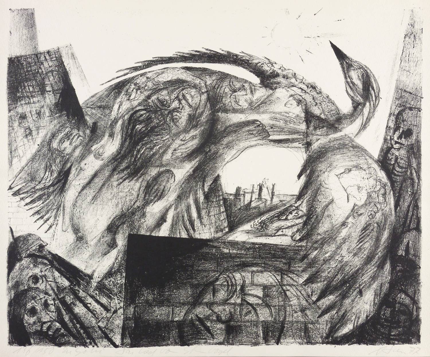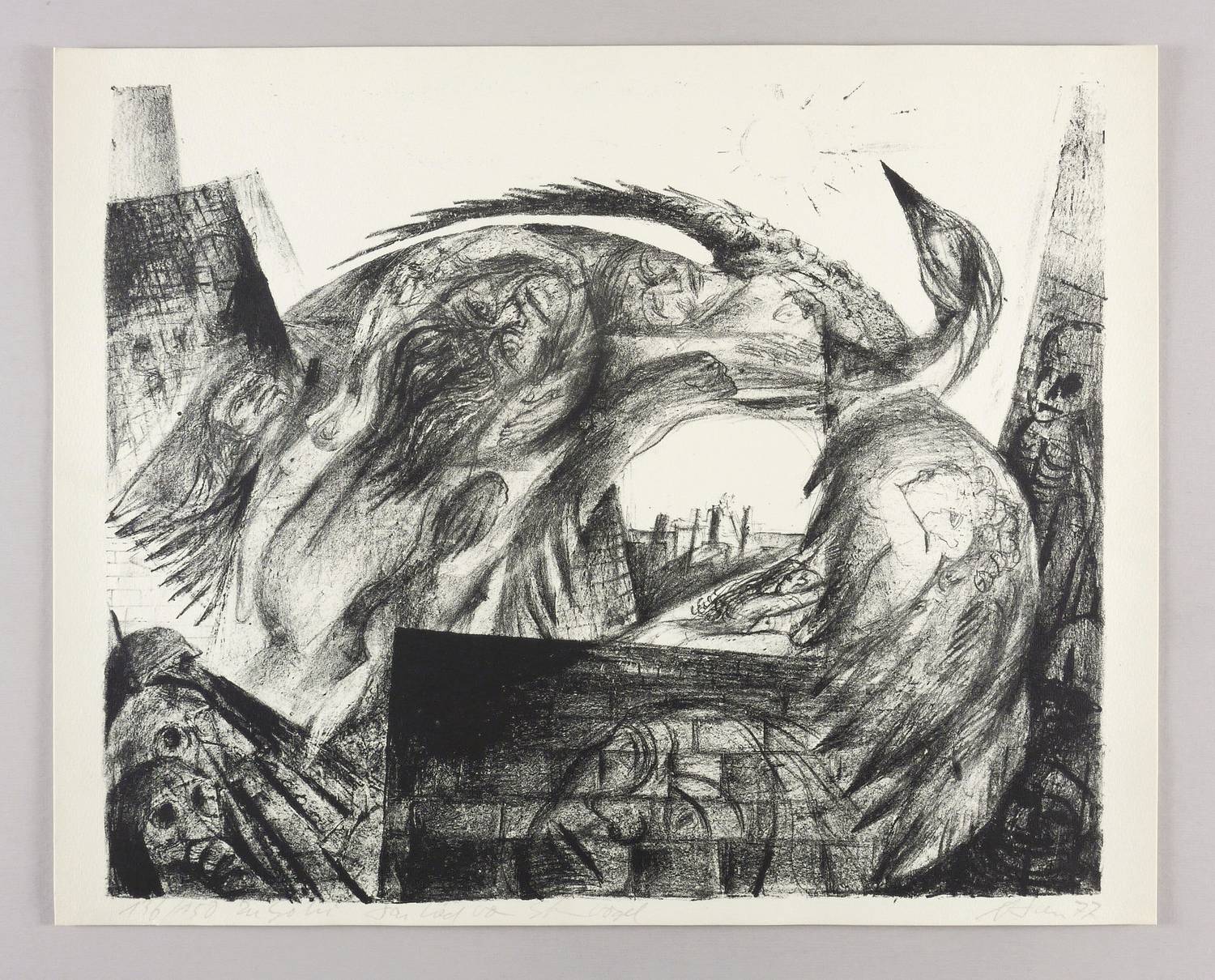 Aus: Falko Behrendt u.a., Imagination Format (Dresden: eikon Grafik-Presse 1976). – Rechts unten in Bleistift signiert und datiert: ″A. Dress 77″. Links Auflagenbezeichnung: ″36/150″. Mittig Titel: ″zu Gorki / Das Lied vom Sturmvogel″. – Sehr guter Zustand.