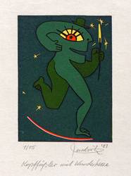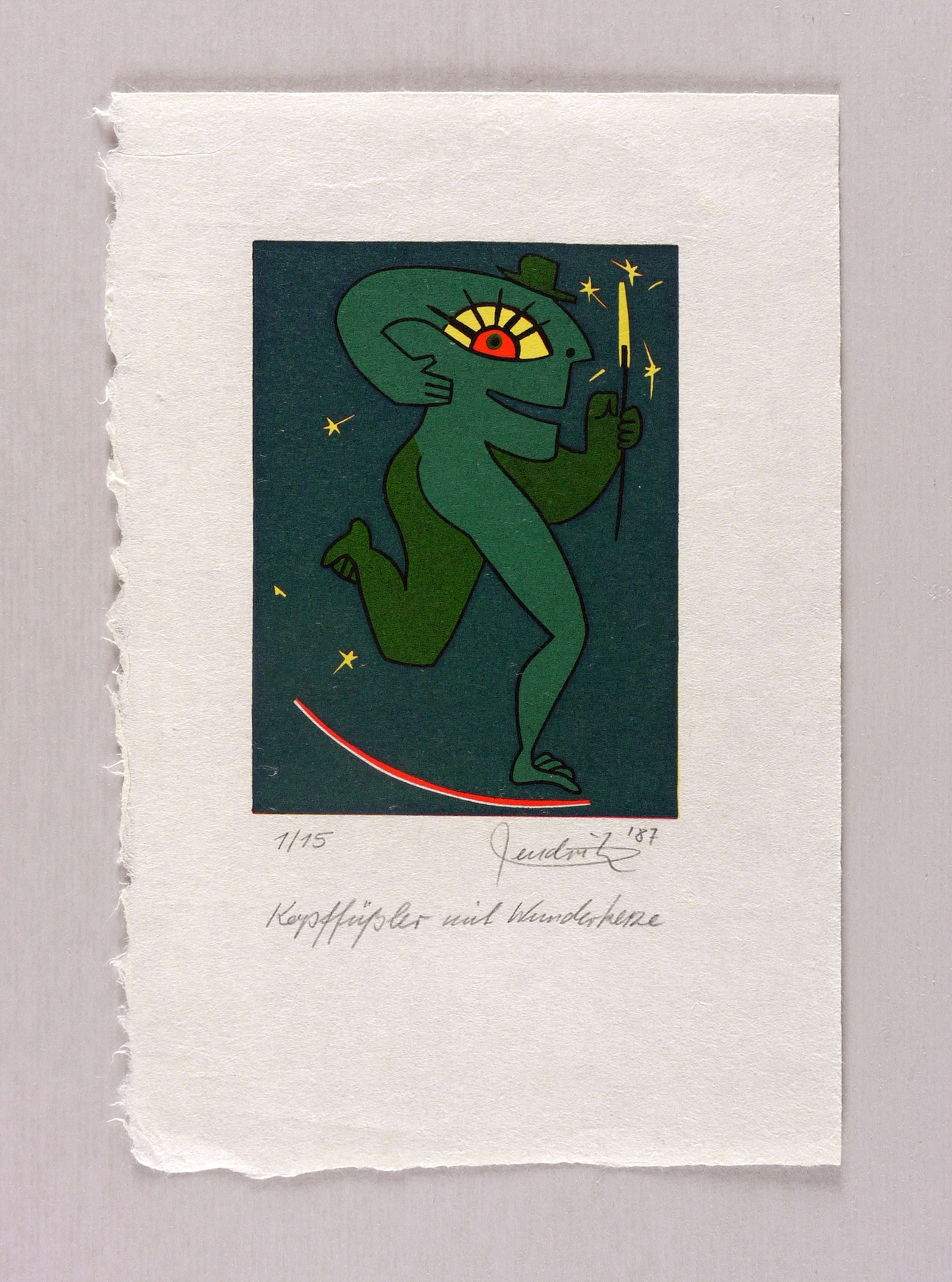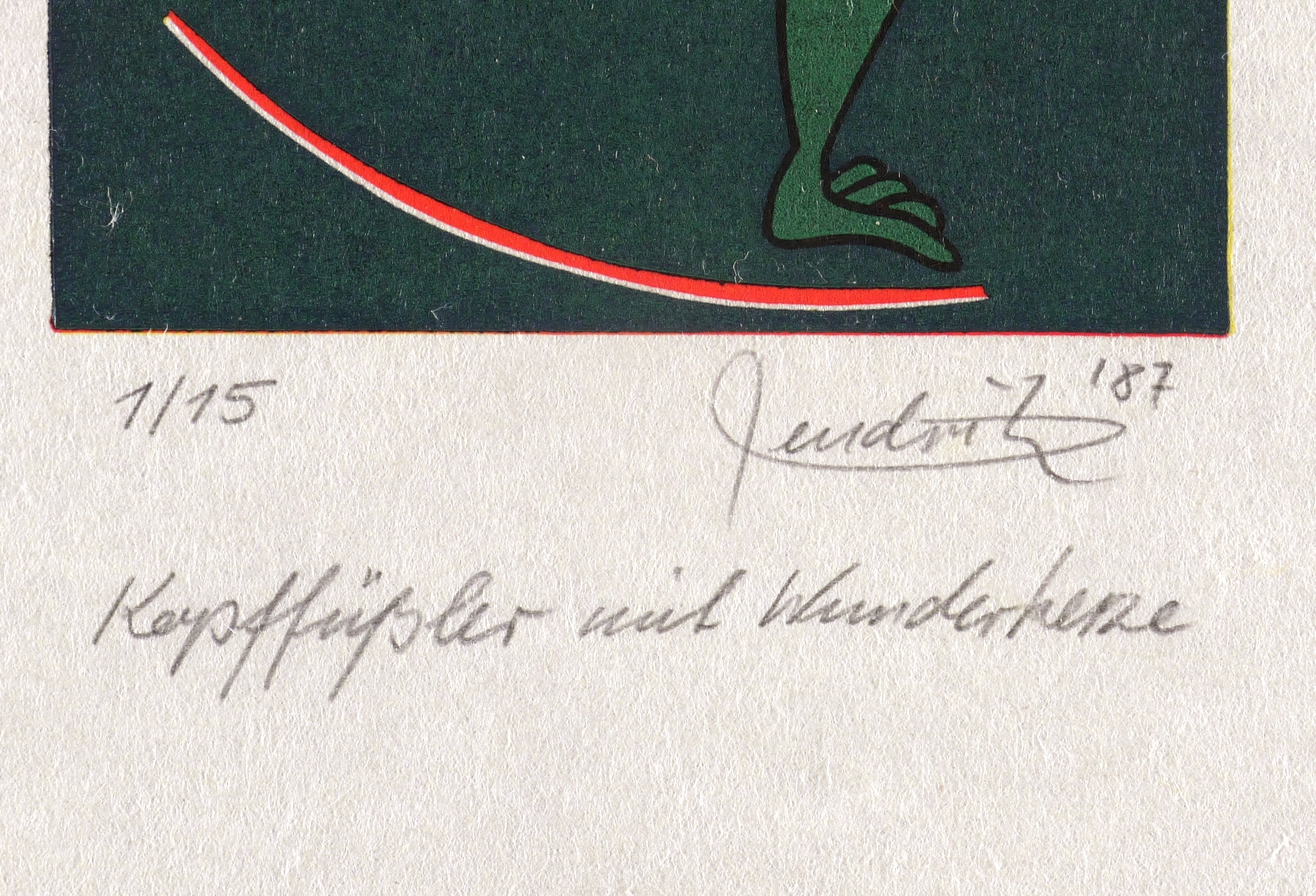Rechts unten in Bleistift signiert und datiert: ″hendrik 87″. Links Auflagenbezeichnung: ″1/15″. Darunter Titel: ″Kopffüßler mit Wunderkerze″. – Sehr guter Zustand.