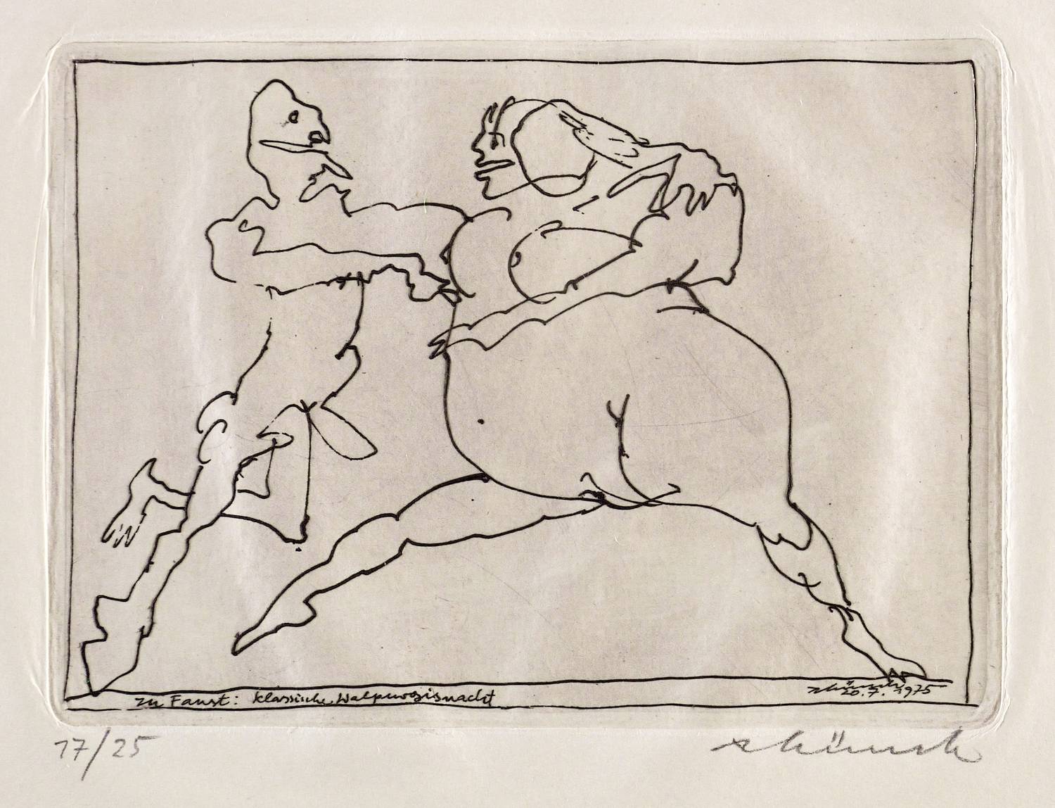 Rechts unten in Bleistift signiert: ″AMünch″. Links Auflagenbezeichnung: ″17/25″. In der Platte rechts unten zusätzlich Signatur und Datum: ″Münch 20.7.1975″. Links Inschrift: ″zu Faust: Klassische Walpurgisnacht″. – Tadellos. Sehr guter Zustand.