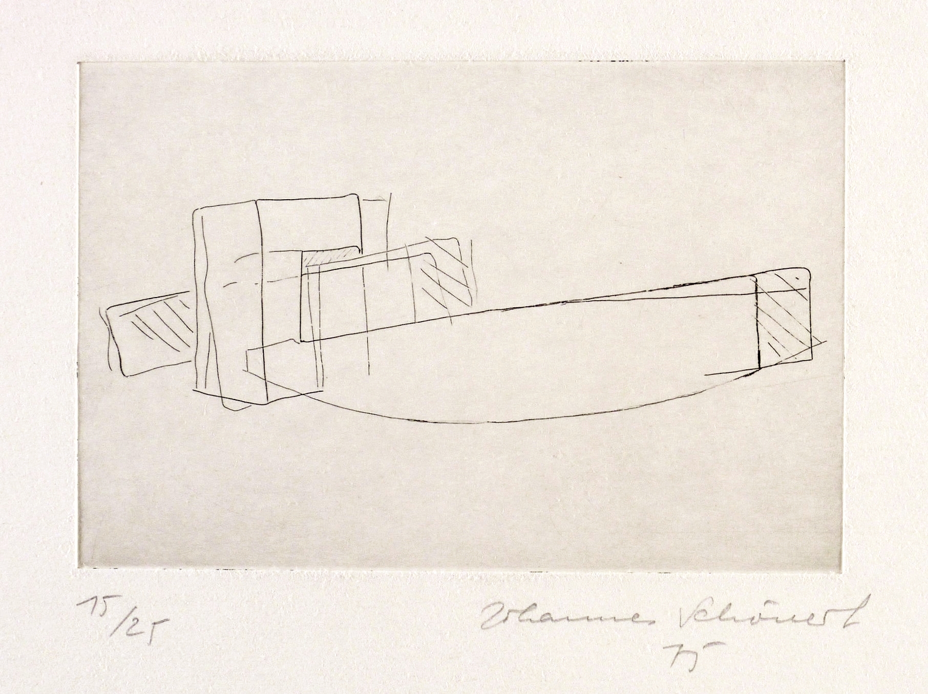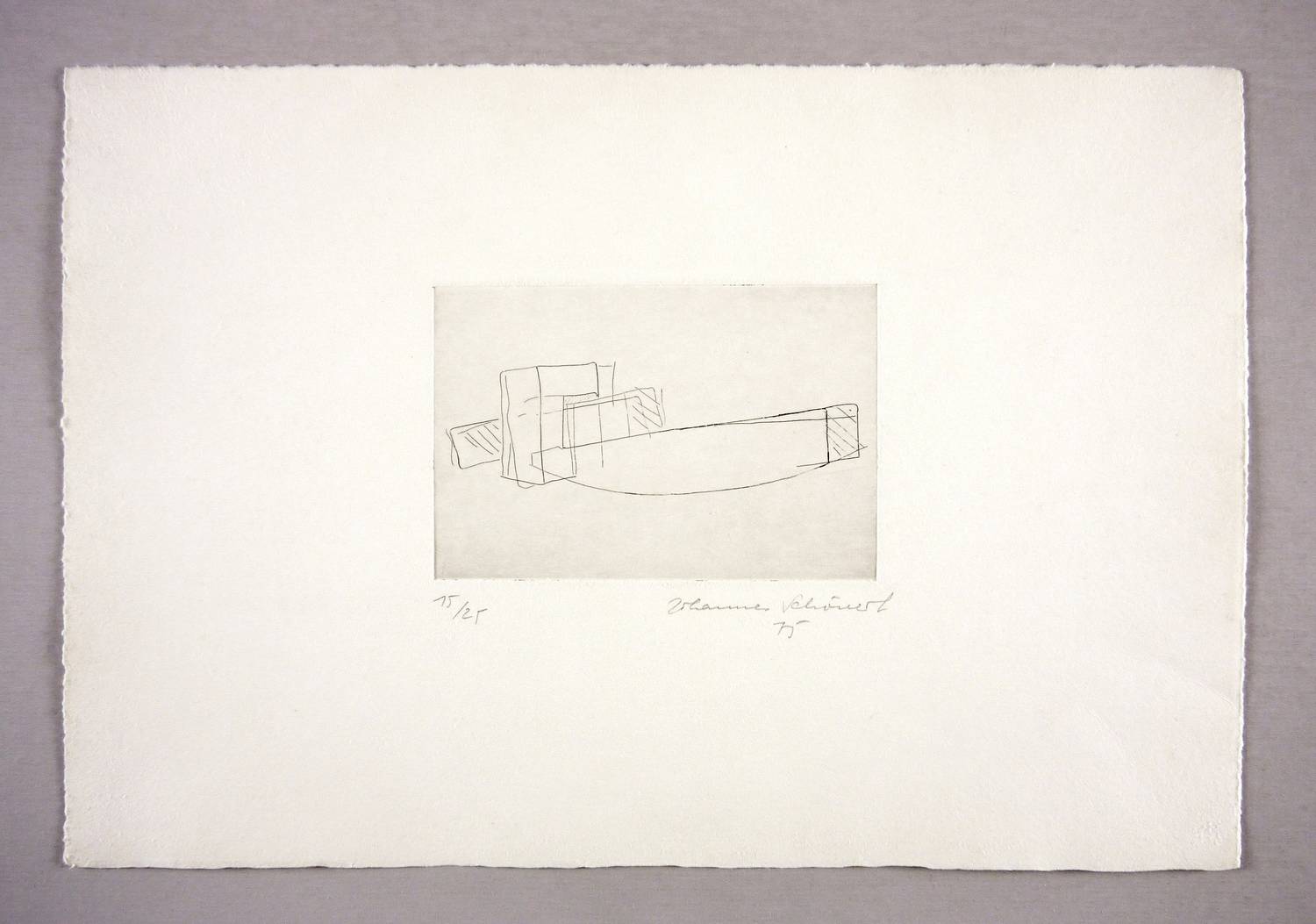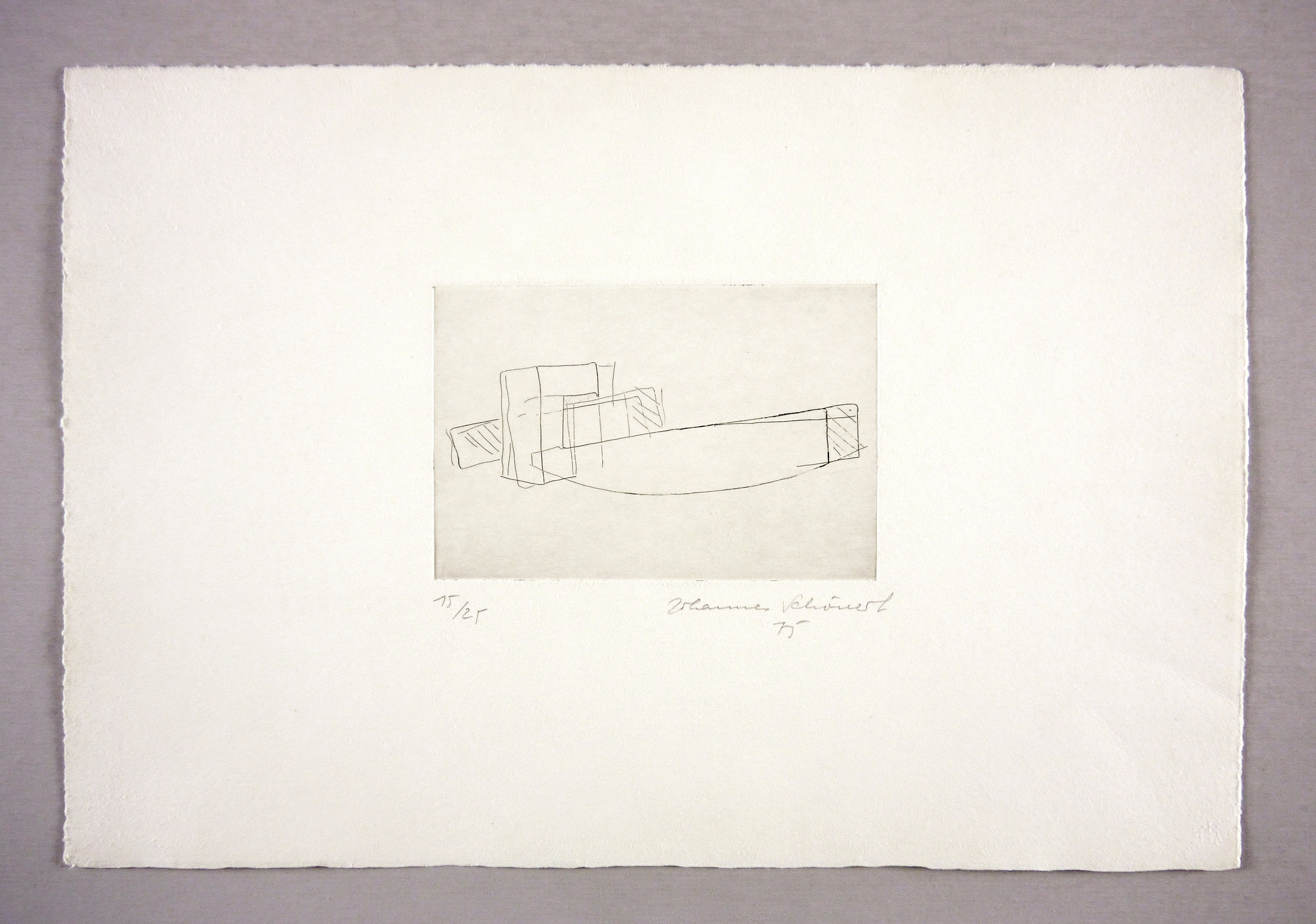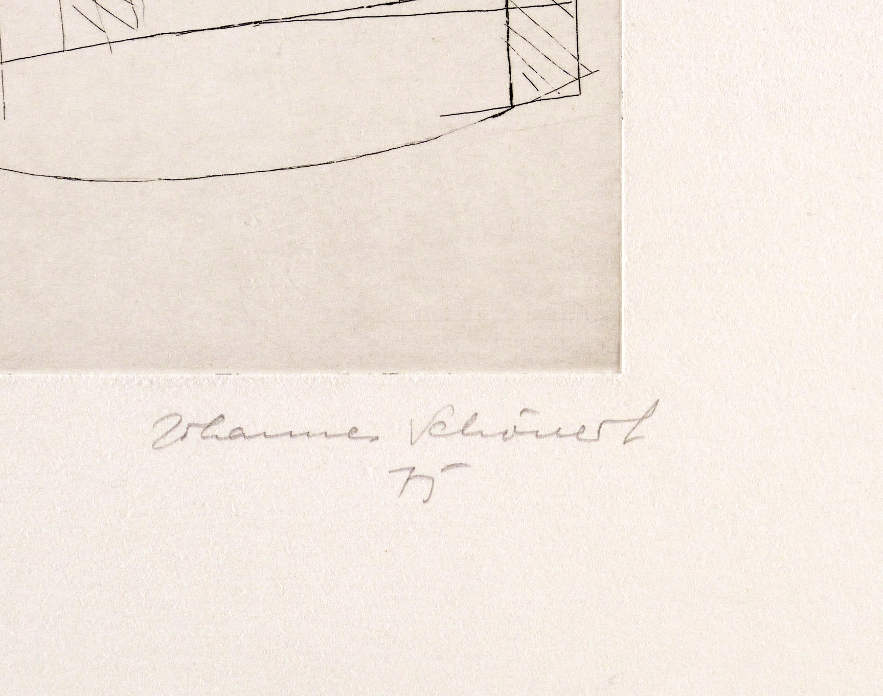 1975. Radierung / Strichätzung, in Schwarz, auf hellchamois Velinkarton. – Originale Künstlergrafik, von Johannes Schönert. – Auflage Exemplar Nr. 15/25. – 10,0 x 14,8 cm (Darstellung / Platte), 27 x 40 cm (Blatt).